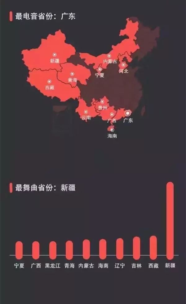 这张图我还是有些话想说,网易云的音乐风格标签里将“舞曲”和“电音”做了区分。而其实舞曲是一个属于电子音乐范围内的曲风统称,也就是说严格意义上,这个数据应该呈现舞曲/电音的数值为26.11%,而不是分开统计,离流行音乐的30.14%已经不远了。