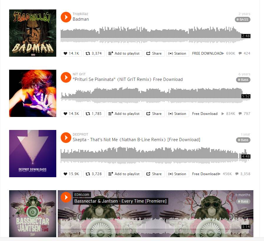 所以我们来论证一下,现代电音爱好者或者电音制作人口中的Bass音乐到底指哪些音乐风格。我们使用全世界最大的音乐软件Soundcloud来论证一下术语使用习惯,看看我们在Soundcloud上找到的20首Bass音乐具体是什么音乐风格。