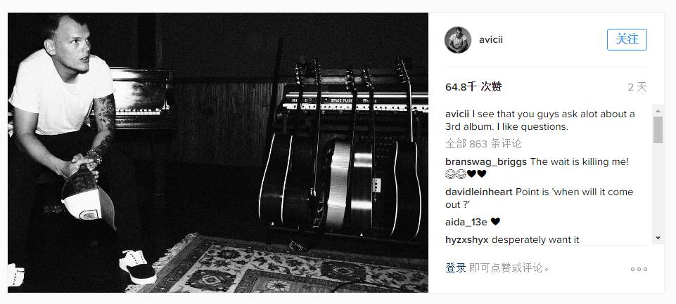 过去不久的两天前,Avicii称“我看到你们问了很多关于第三张专辑的问题,我很喜欢这些问题”。不包括单独发行的单曲在内,他之前的专辑的确只有两张,分别为《True》和《Stories》,顺便也证明了这次要发行的不是只有一首。最重要的是这张专辑配上的照片是Avicii在自己的工作室,解释了他已经着手开始制作。Avicii不会放弃音乐,没有继续演出估计已经让他按耐不住对电子音乐的热情,期待着这张专辑放大招吧。