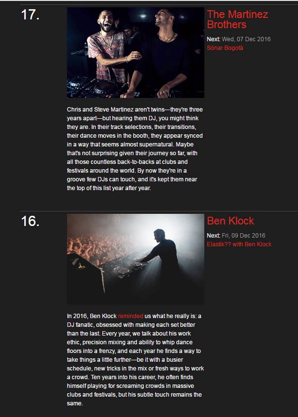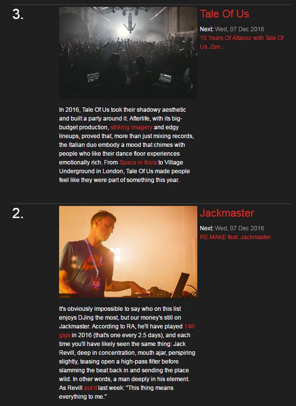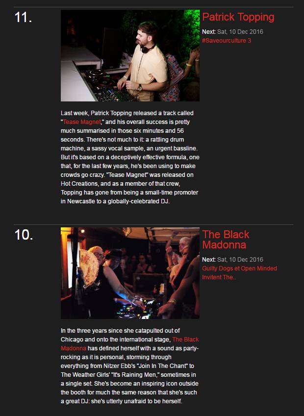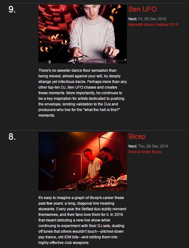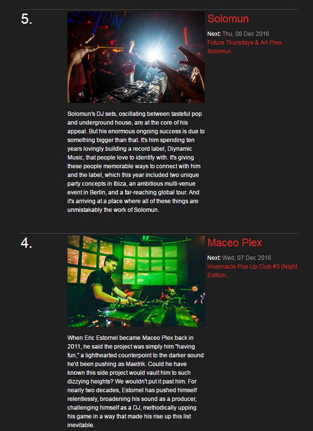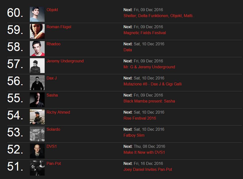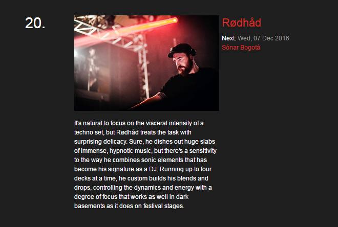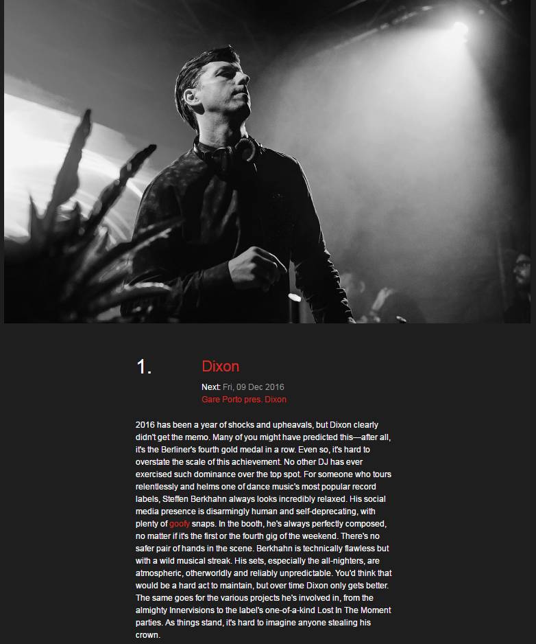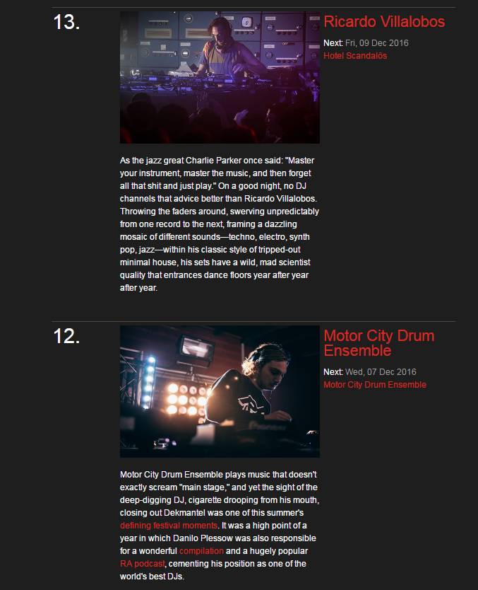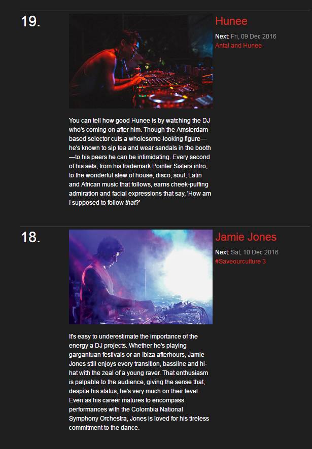 答案很简单,RA是一个主攻地下电音的网站,而DJ Mag从一开始就是主攻商业舞曲,所以除非平时对地下电音接触得比较多,否则可能会一个人都不认识。还有RA对Techno这一块的收录最为频繁,所以榜单2/3的艺人都是Techno曲风。最重要的是区别是,RA投票的前提必须是你看过他的演出,而且这场演出还必须是RA的活动列表上收录的,这对于“谁可以投票”添加了一定的门槛。最后,算完自己认识几个人了吗?