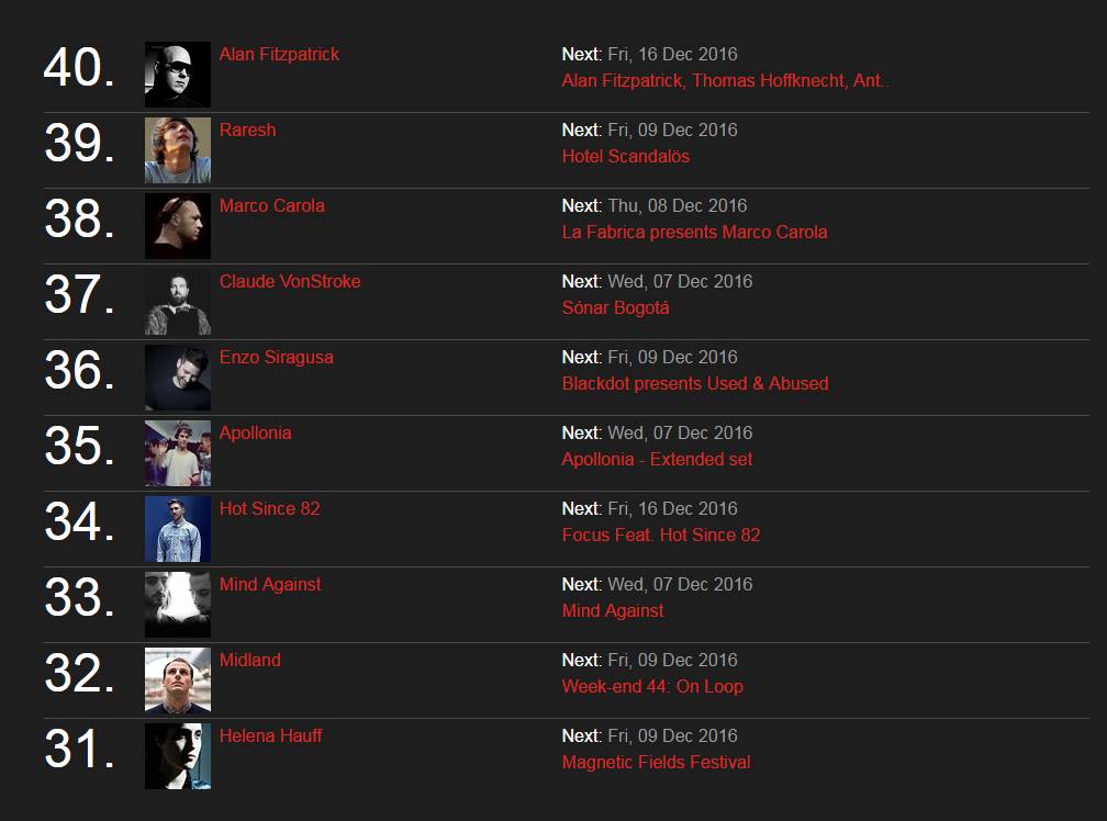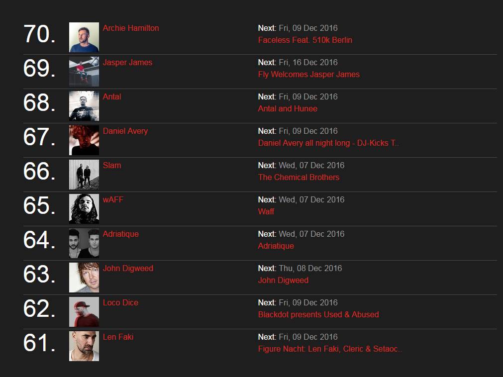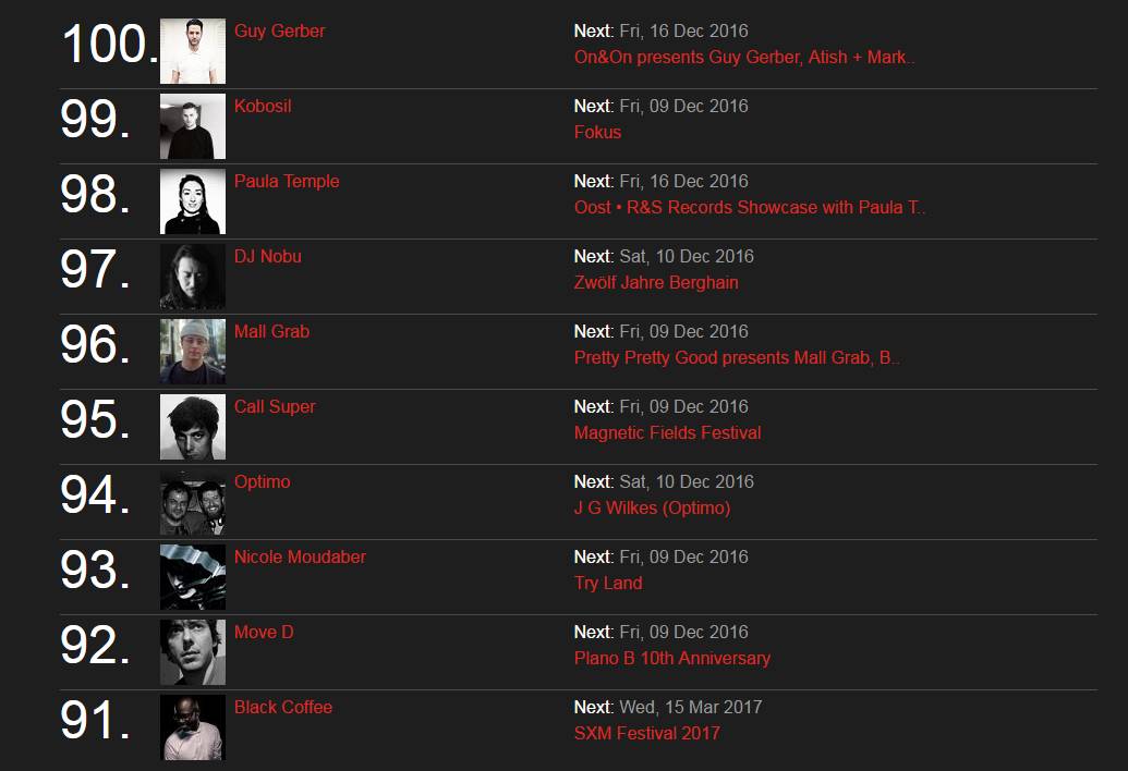 那么我们就来看看今天凌晨刚出炉的RA百大DJ排行榜今年是什么情况,最好是跟着我们数一数你认识这里的多少位艺人,因为很多时候你觉得自己对电音了如指掌,但或许只是你自己以为而已。不得不说,我自己对于这张榜单的艺人只认识一半左右,也不敢说透彻,稍后我们再具体聊聊。