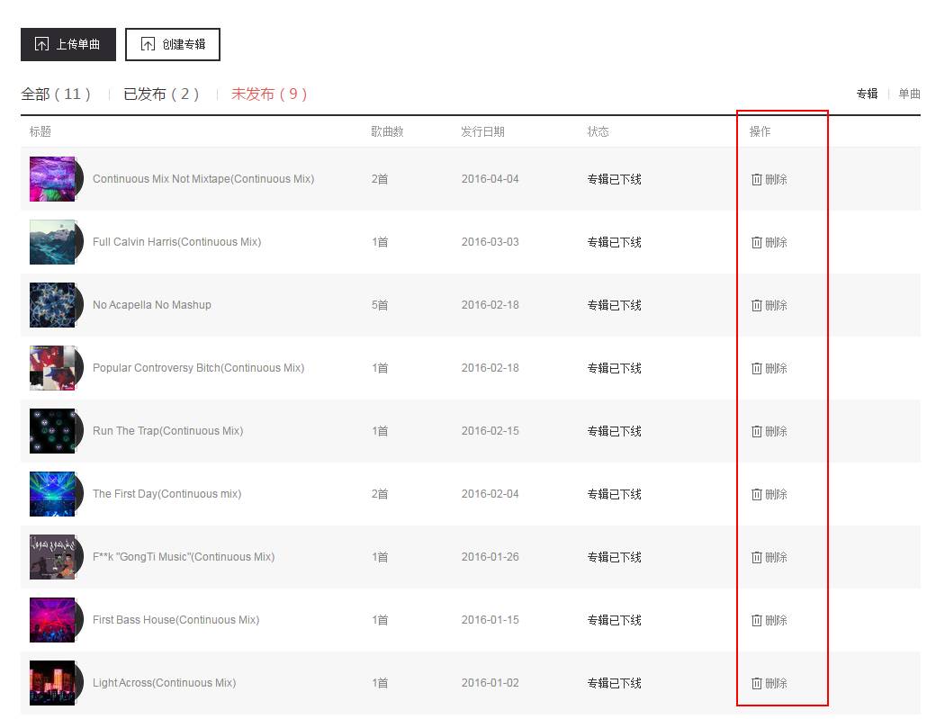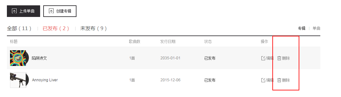 借此机会也想提一下关于网易云音乐在这方面功能的话题。一段时间以前,网易云音乐关闭了网易云音乐人下架自己的单曲这一功能,这是个天大的麻烦。可就在这几天,网易云音乐重新开放了专辑的删除功能,但可惜现在已经不是下架。对于在此之前你已经下架的专辑也不能重新上架,只能删除。如果你想删除不要的专辑,那么恭喜你重新获得自由,对你来说是好事。如果你想上架已经下架的专辑,那就只能重发了。