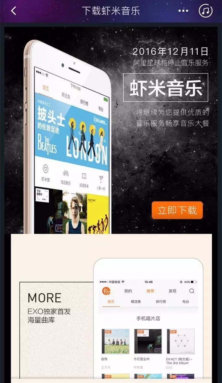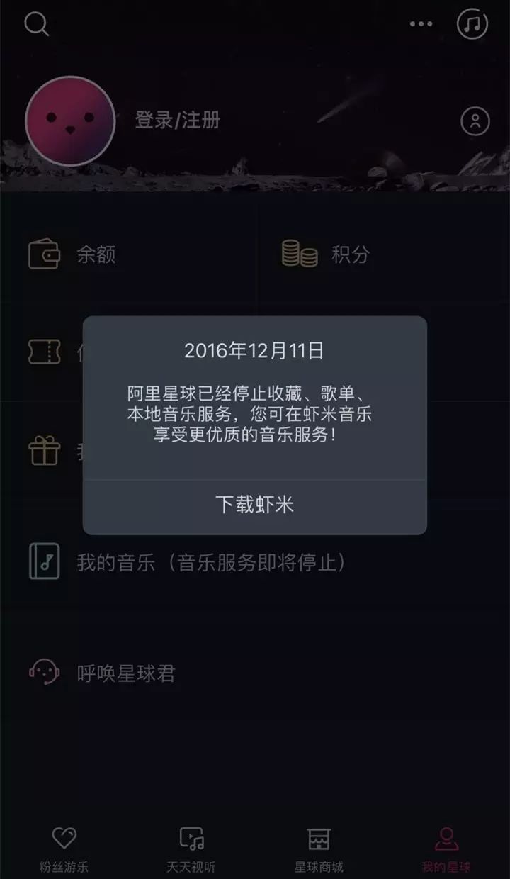 就在最近几天,这是别人眼里的大新闻。12月11日,阿里星球终止了所有音乐服务,只能打开而不能使用,并且尝试把用户往虾米音乐引导。但其实曾经虾米音乐就是把阿里星球作为一个后身去使用的,除了操作以外,曲库完全同步,也就是说虾米音乐转移阿里星球的计划彻底失败了,现在又要把用户往回倒,好比有些虾米用户经历了移民,现在又移民回去。这好像一点也不让人伤心,下一个是酷狗还是酷我或是QQ音乐?