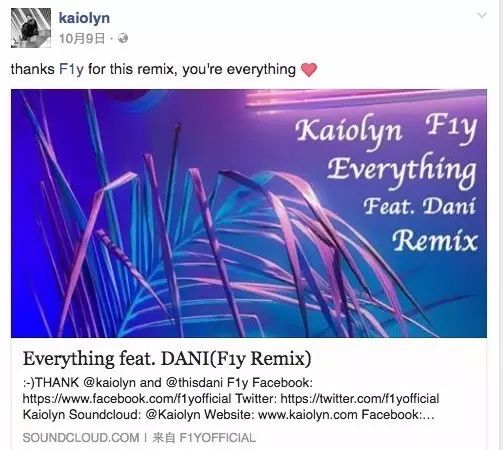 他最新Remix的《Everything》同样受到原制作人Kaiolyn和歌手Dani的纷纷赞扬,甚至在社交网络公开上推荐。对于喜欢Chill-trap和Future Bass的你来说,这或许会是刷新你三观的国人力作。狂欢之后,足以让你放松地跳支舞。据说,F1y正在筹备新的原创专辑,而且会推出很少人尝试的中文Future Bass。