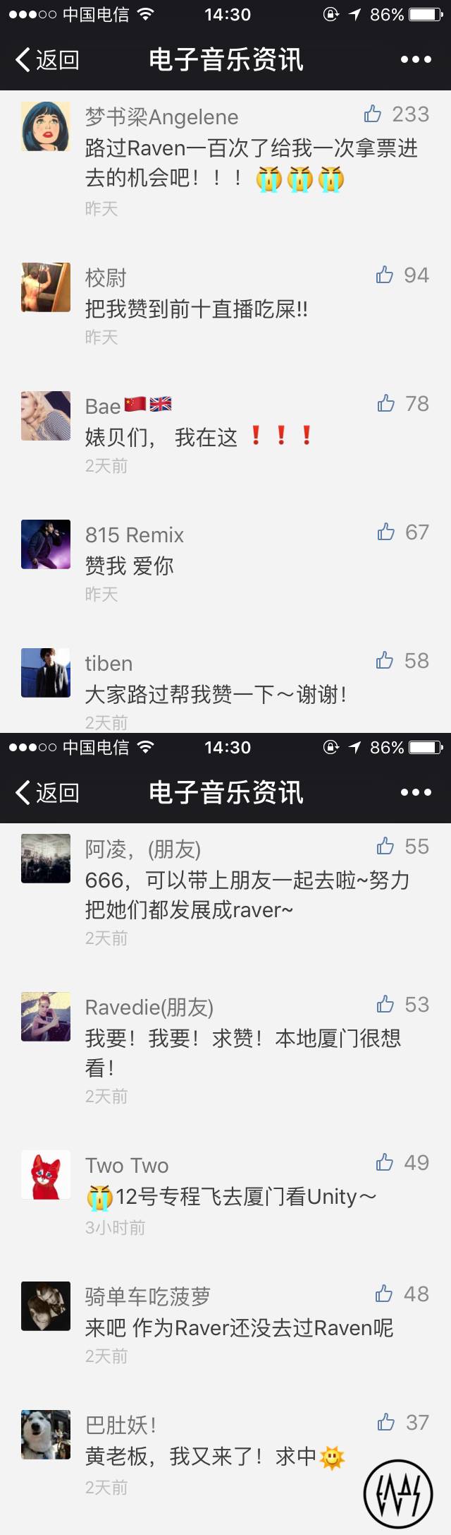 如果送三十张门票还是带不动厦门,那么不管电音文化在全世界发达到什么程度,即使在中国一线城市不亚于流行音乐,那么对于本地人来说也不算完成任务。厦门的小清新气质光从鼓浪屿就可以证明,被包装成小清新城市倒没什么,但民谣不应该与之划等号。带你们去躁一下,看看Laidback Luke和Unity。截止到今天14:30,截图当中正是分别获得三张门票的十位粉丝,请获奖者尽快将三位入场人员的名字/电话发送至后台。
