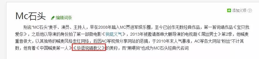 MC石头,smart hiphop创始人,将这种中国独有的说唱形式命名为喊麦。因为看不起国外MC只会RAP,没有新突破而创造出来的新说法,十分乐意看到现在大家把国外MC的MCing明明是RAP却说成喊麦这件事儿,证明了他的影响力已经传遍了全球,国外本没有喊麦,国外MC玩的本来就是RAP,而有了smart hiphop,全世界的RAPPER都应该被喊麦所影响,都开始接触我们中国大杀马特文化与说唱的结晶!杀马特黑帕!你们看看,他多谦虚啊,是一个多么低调的美男子,他既然说自己是音乐风格是Alternative Hip Hop,我天,虾米没有smart hiphop这个风格是因为嫉妒你啊,你不能因此就放弃自己的音乐风格啊。Alternative Hip Hop玩的可是说唱,而你的smart hiphop玩的是喊麦啊,你千万不能放弃自己的音乐风格!你就是smart hiphop,千万不要再说自己是Alternative Hip Hop了。smart hiphop,中国独有的说唱音乐风格,并且将国内MC的喊麦和国外MC的RAP严格地区分开来,甩开国外MC玩的RAP一万个恒星距离!