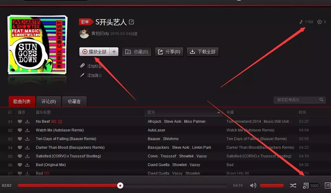 也就是说,我建议各位一个歌单最多放1000首歌,因为如果你放了1100首歌,剩余的100首就无法进入到播放列表里去。放了1200首歌,剩余的200首歌就不会进入到播放列表。(这个上限10000才是最操蛋的,只能播放1000首到播放列表为什么要设定超过1000首的上限)