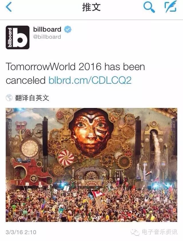 最知名的音乐榜单之一:billboard 也公布了tomorrowworld取消2016的讯息。