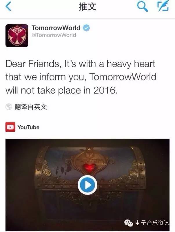 翻译:亲爱的朋友们,带着一颗沉重的心,我们通知你,tomorrowworld在2016年不会举办。