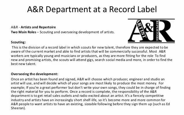 A&R的任务是挖掘厂牌所需要的艺人,他们将决定什么艺人会被签约到自己的厂牌里,什么样的单曲适合在这个厂牌发布。如果你不认识A&R这个职业,你甚至不知道你的音乐会被谁审核,又需要去迎合谁的胃口,亦或者有没有被选中的可能。