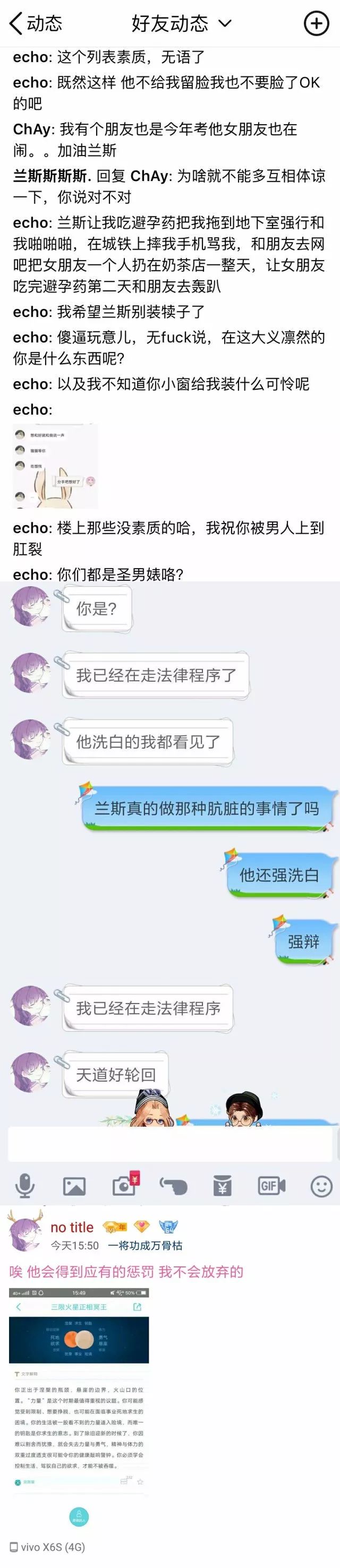 有粉丝投稿称,Forwe兰斯对前女友进行了Rape以及传播了所拍摄的视频,并有一些相关截图指出Forwe兰斯可能会摊上官司。但有关于这个话题,我们不选择任何站边,绝对中立,仅作为报道,并且会持续关注事件的发展动向和真相。