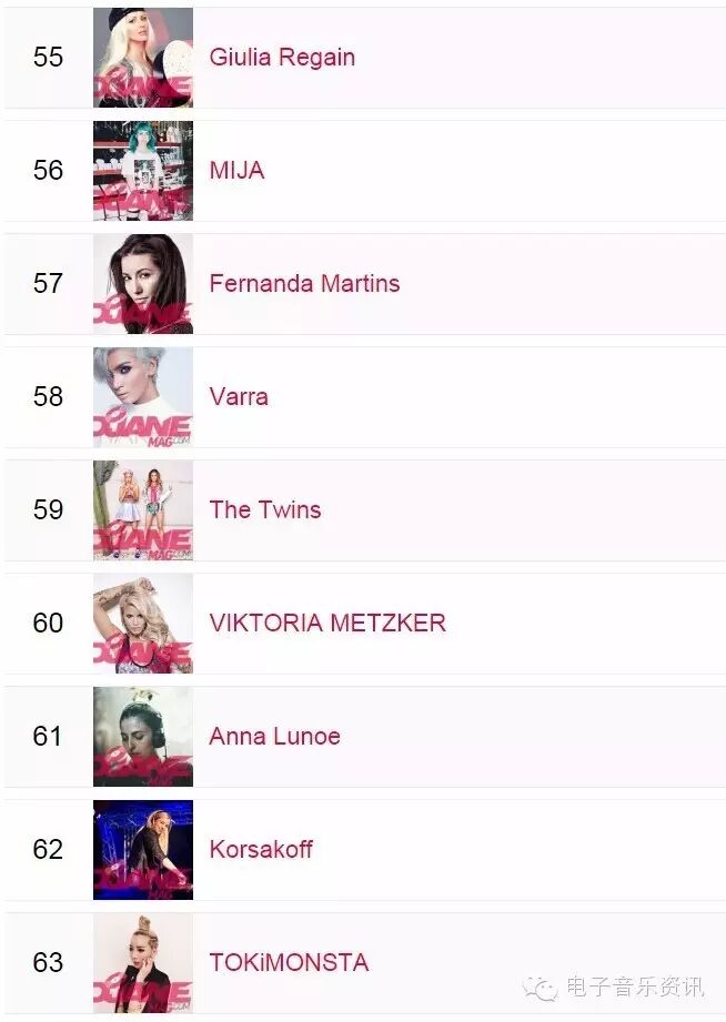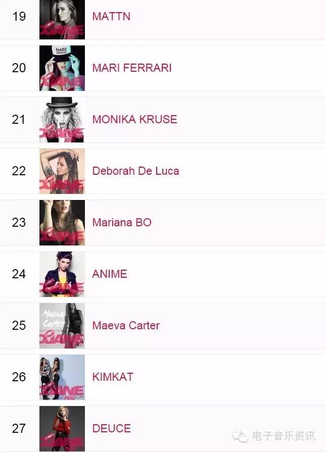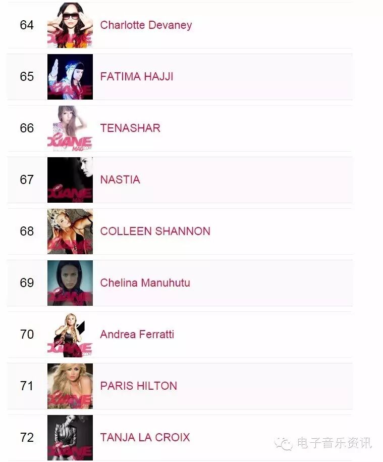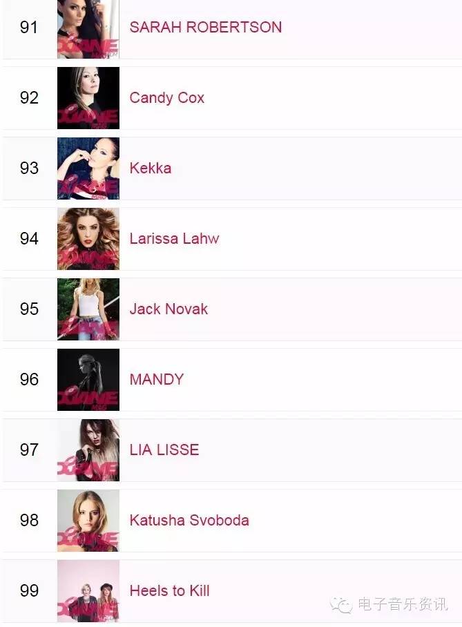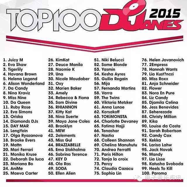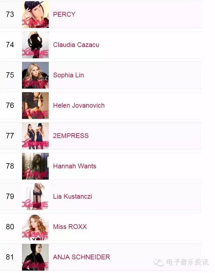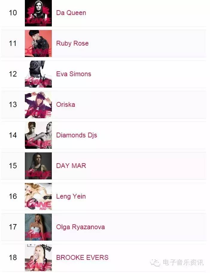 榜单来自djanemag,如同DJMAG的百大DJ一样,每年举办一次投票,得出结果。榜单为2015年数据,2016还没有开放投票。