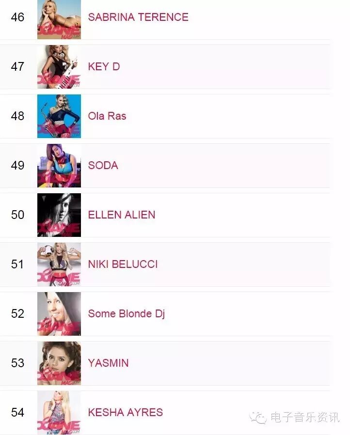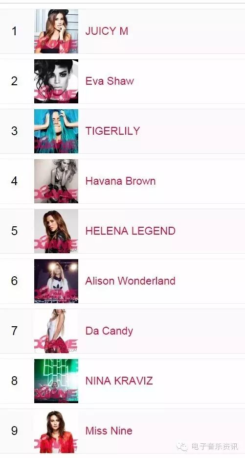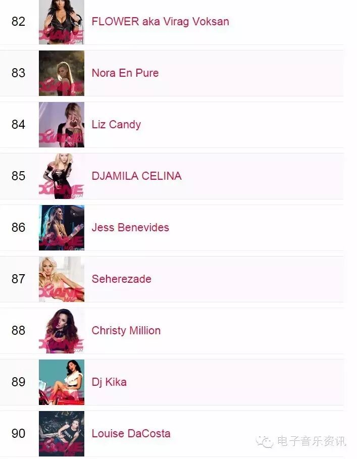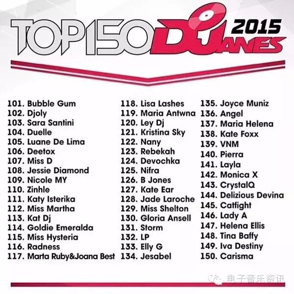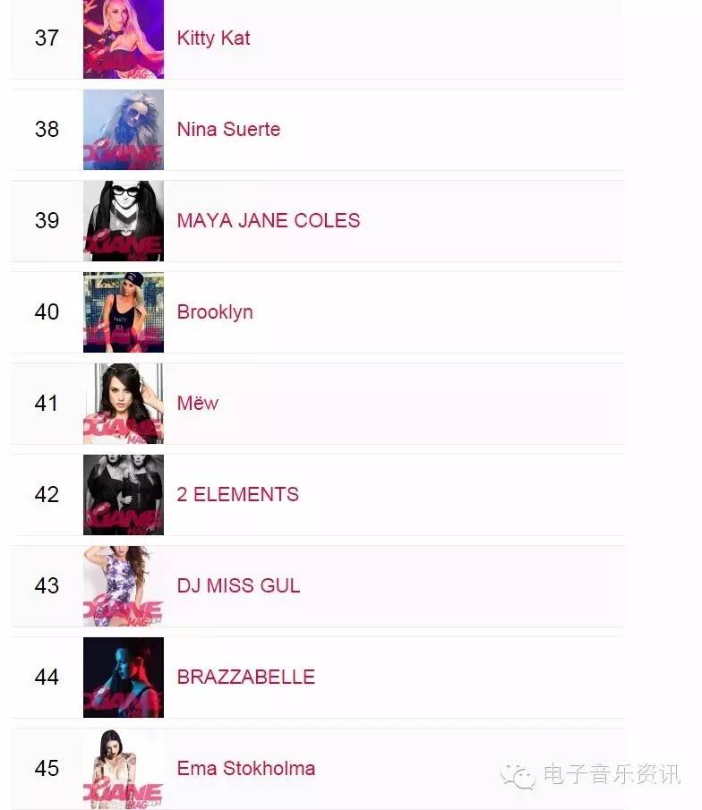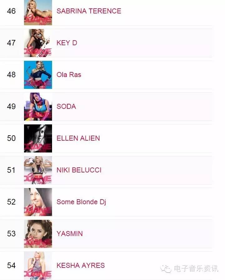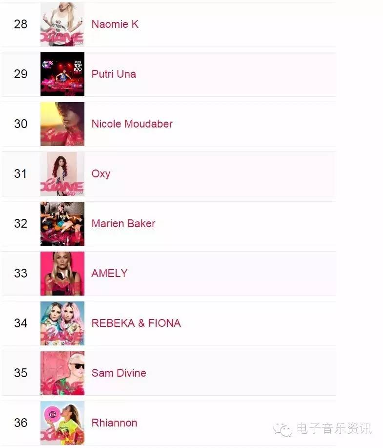 榜单来自djanemag,如同DJMAG的百大DJ一样,每年举办一次投票,得出结果。榜单为2015年数据,2016还没有开放投票。