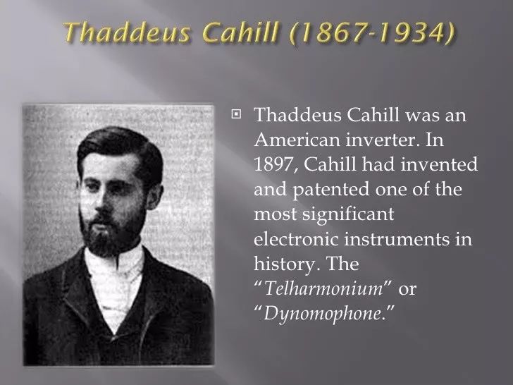Thaddeus Cahill是绝对意义上的时代先锋,他在1896所设计的Telharmonium就已经具有类似于合成器的功能。Telharmonium可以模仿很多乐器,通过电子技术调制出不一样的声音,正因为电子乐器的特殊性,才能让电子音乐成为独立存在的音乐风格。