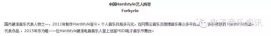 好的事实摆在眼前,Forkyrie的确是一个hardstyle制作人,而不单单只是一个接歌混音的DJ而已。打碟很容易,找我买台机器没多久就可以会。但是音乐制作水平就摆在那里,hardstyle爱好者自己可以判断。也的确登上过Midi舞台,因为Forkyrie只是国内的小艺人,名气没有那么大,这个官方也没把他吹大,他本来就不是国际艺人。但官方介绍显然也没有华而不实,你只用百度搜索当然搜不到啊。