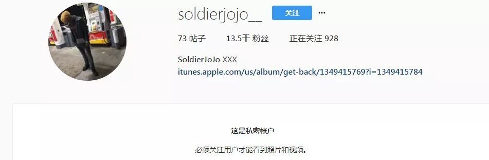 反观Soldier Jojo,目前已经将他的Instagram账号转为私密账户,所以我们无法看到任何相关的信息。除非Soldier Jojo同意Instagram好友请求。