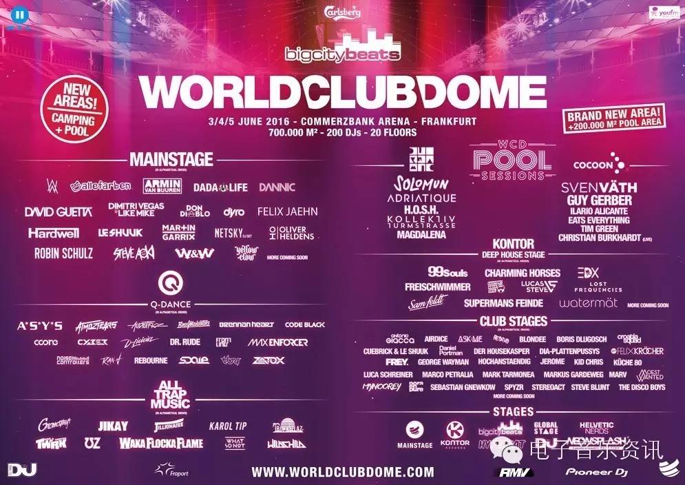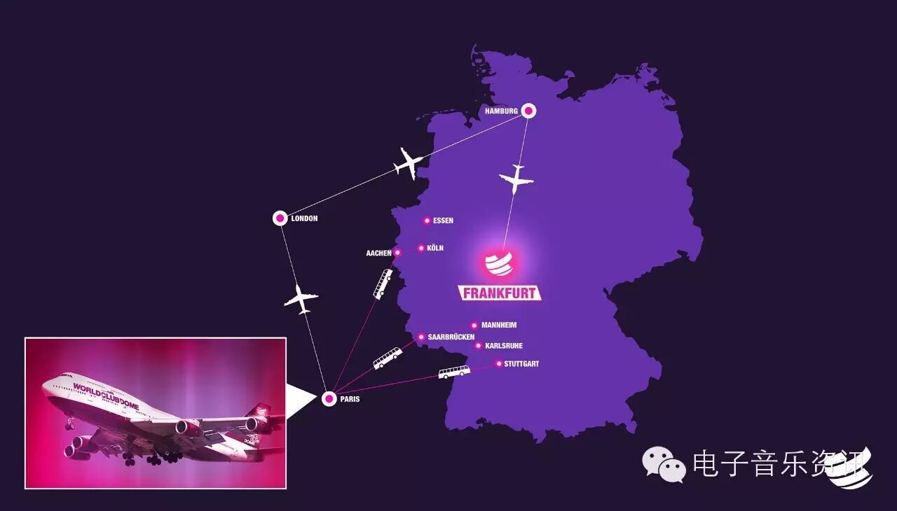 这个电音节的具体位置在Flughafenstraße, 60528 美因河畔法兰克福, 德国。名字叫做World Club Dome,虽然名气的确没有那三个人数最多的电音节大,但三年来阵容都很不错。如果国内也能做到这样就完全够了,完全不会再有人巴结入门级Raver了。