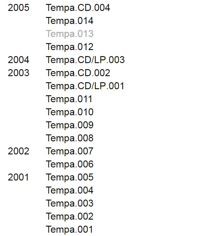 自2000年到2016年,Tempa Recordings发布过许多具有标志性的Dubstep音乐,且所有作品,均分为数字唱片与实体唱片两个部分发布。结合了数字唱片的现代模式,又结合了物理唱片的传统模式,Tempa Recordings为某种时代、阶级建立了桥梁。