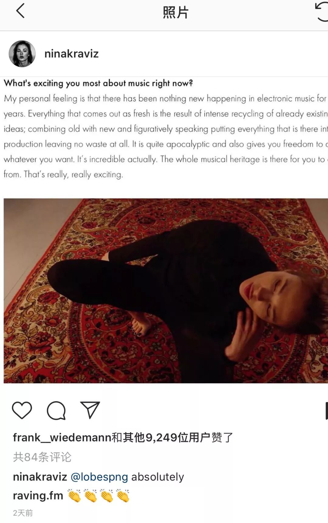 以上内容仅为大意解释,并非直译!如果你在意它的直译,请自行完成直译工作。虽然Nina Kraviz的这条动态看似在谴责电子音乐陷入了一层不变的末日的死循环,但结尾处Nina提出“这实际上是令人难以置信的,所有音乐遗产都被提供于帮助你的创作”。