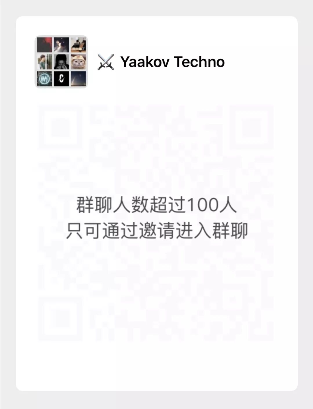 就在最近,Yaakov建立了一个新的粉丝群,命名它为“Yaakov Techno”,这不是一种曲风,这是一种个人人设标签。现在,你可以扫描下方二维码,添加Booking Agency/Agency项目DarkGlow的官方微信,注明“Techno”,即可进入群聊。