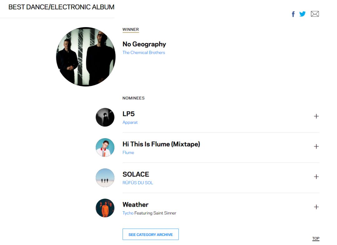 最佳电音、舞曲专辑奖:如许多人所料,The Chemical Brothers的《No Geography》荣获2019年最佳电音、舞曲专辑,在五张提名专辑中脱颖而出。自上世纪90年代起,传奇的著名组合The Chemical Brothers多次取得格莱美奖项的提名或夺得冠军。