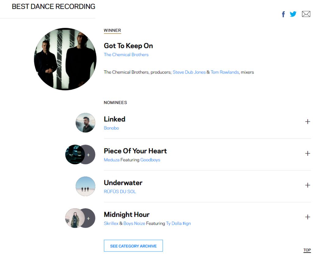 奖项完整链接(理论上未要求乐迷或锐舞者们具有“正常上网条件”):https://www.grammy.com/grammys/awards/62nd-annual-grammy-awards-2019