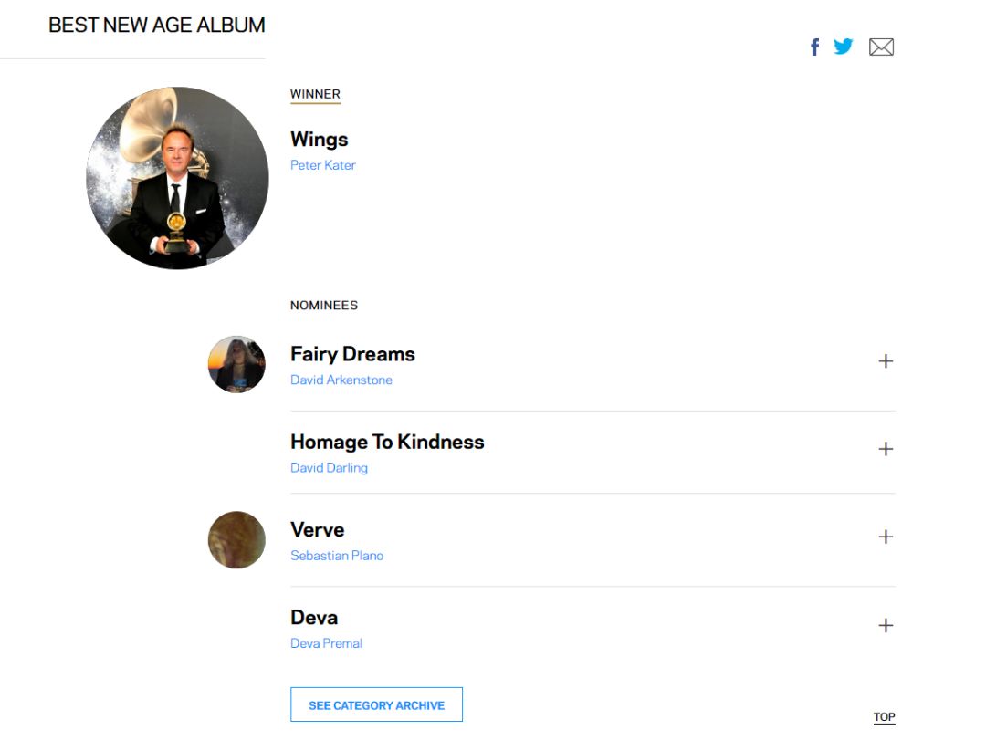 最佳New Age专辑:New Age是电子音乐中的一种非舞曲的子类型,与Chill-Out/Downtempo/Ambient一样无时无刻不在提醒我们电子音乐不完全等于舞曲。在本届提名的五张New Age专辑中,Peter Kater的专辑《Wings》有幸成为了最终的冠军。