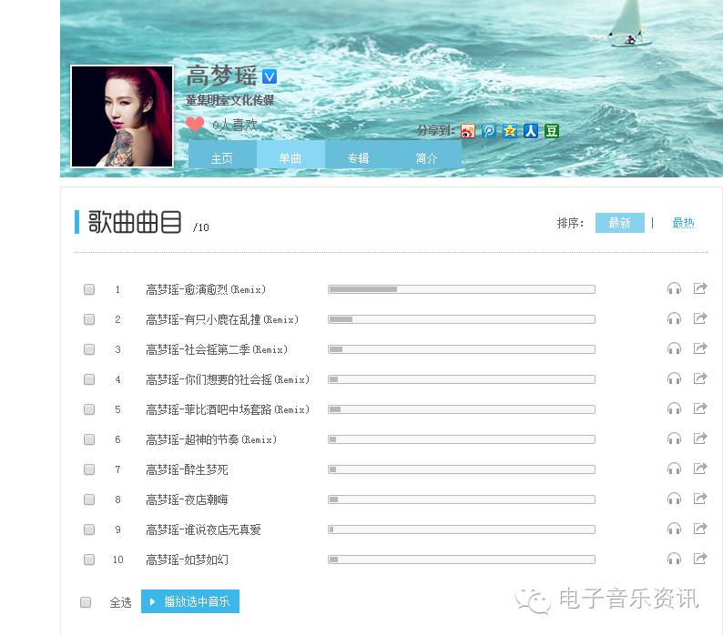 这是在酷狗上加了认证的高梦瑶。音乐风格全部为Melbourne Bounce(我们来超级严肃地站在音乐风格的角度上洗白一下什么是土嗨音乐。)。因为我自己的原因非常不喜欢Melbourne Bounce,我就不评论水平好坏了,反正怎么的都喜欢不起来。不过提个建议,歌名很重要。