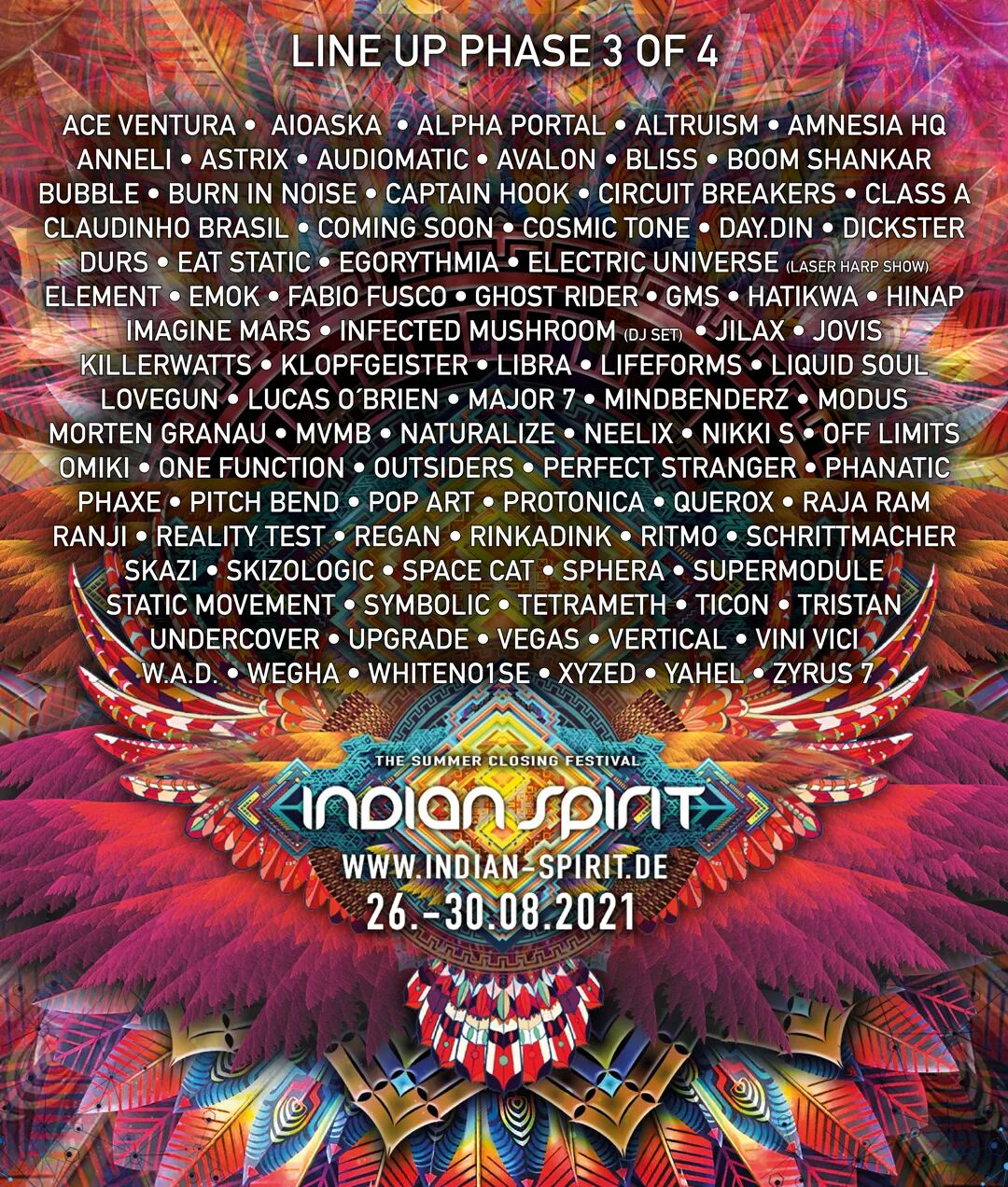 Indian Spirit Festival阵容可谓Goa Trance/Psy Trance领域的世界之最,常年出席的国际大牌DJ/制作人就有Infected Mushroom、Vini Vici、Neelix、Astrix、Electric Universe、Ace Ventura、GMS、Liquid Soul、Avalon、Tristan、Bliss等等。