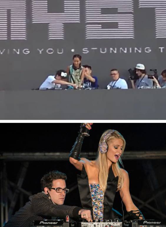 可能很多人无法识别是不是假打,简单说一下。打碟的工作就是接歌混音,将一堆音乐通过DJ的技术衔接在一起就叫打碟。然而她在打碟过程中许多次一首单曲接另外一首单曲的时候,手并没有任何操作。