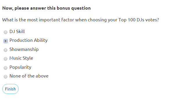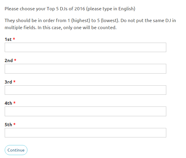 ⒎填写五位音乐制作人&DJ的名字。因为非音乐制作人会直接被DJ Mag排除掉,这是一个我公开过的秘密。记住一次投票中不能重复艺人(DJMag百大DJ排行榜投票小提示。)。