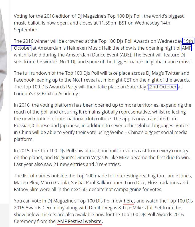 官方信息。2016百大DJ将于英国时间9月14日11:59PM结束投票,前十名将在世界第四大的电音节AMF的第一天也就是10月19日被颁奖。完整的百大DJ排行榜将于10月22日在伦敦的O2布里克斯顿学院公开。请勿相信任何已经出结果或其它时间公布结果的谣言(2016百大DJ排行榜提前曝光?是真是假?)。