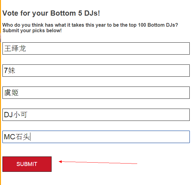 ⒊设计很理性化,一进入网站就是投票页面。直接写入五个名字即可。记住DJ只是职业不是音乐风格(国内一半的人都是土嗨?土嗨是什么意思?)。