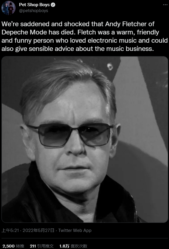 也正因为如此,当天,Depeche Mode官方通过社交媒体发布了这一噩耗并向Andy Fletcher表示悼念、敬意时说道:“Fletcher有一颗真正金子般的心,当你需要支持、深挚的交谈、愉快的笑声以及冰凉的酒饮时,他总会在那里。”