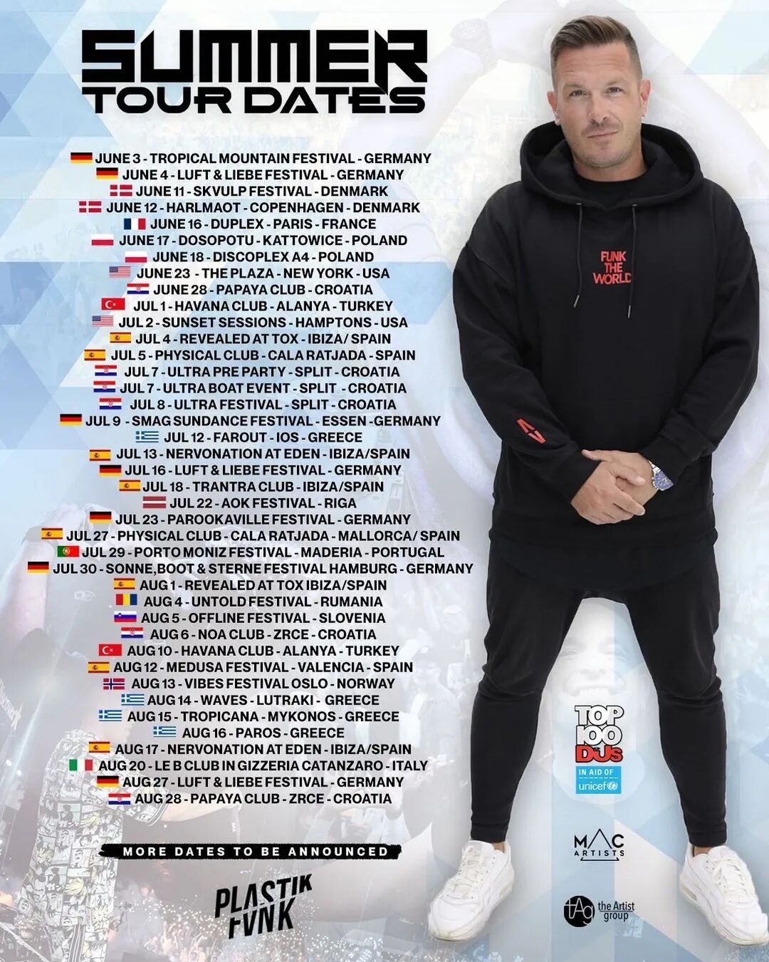 那么在海外解除Covid限制(锐舞派对的、音乐节的、艺人国际往来的)后,谁才是DJ Mag百大DJ排行榜中的巡演新赢家?答案可能不止一个。但笔者认为最具代表性的人物之一,必将包括超新星Plastik Funk(塑料放克),四舍五入等于舞曲新·百大榜·巡演王。图片来自Plastik Funk 图片版权属于原主Plastik Funk起初是一个DJ、制作人双人组,由Rafael Ximenez-Carrillo和Mikio Gruschinske组成,现为Rafael Ximenez-Carrillo的个人项目。Plastik Funk在其职业生涯中制作过Hip-Hop、House、新学院Funk、(非字面)EDM等类型的跳舞音乐,其中多首成为榜单热曲。图片来自Plastik Funk 图片版权属于原主Rafael Ximenez-Carrillo是一个西班牙人,但在德国长大,所以当我们问起Rafael Ximenez-Carrillo的国籍或“来自地区”时会得到不同的答案。尽管笔者已经关注Plastik Funk的Instagram(IG)和Twitter(推特)有一段时间了,但不得不承认,2022年才是Plastik Funk“迅猛发育”的质变转折点。图片来自Plastik Funk 图片版权属于原主2021年Plastik Funk与DJ Mag百大DJ榜单的采访中提到他接下来一段时间有超过60场全球巡演计划,从那个时候开始,他的个人巡演贴上了该榜单的Logo;2022年夏季Plastik Funk的行程更是充分体现了“不是在演出,就是在演出的路上”这句老话的价值。于是,我们通过一些渠道联系了Plastik Funk,并对他发起了一次中国特别采访!⒈你好Plastik Funk!你还记得你上次来中国的时候发生了什么有趣的事情吗?(Do you remember your last time in China, anything interesting happened?)我上次的中国巡演在2020年1月。那是一次体验很棒的巡演,在中国的许多城市落地。但也是从这个时候起,我们逐渐听说了Covid病毒(尤其是第一批Covid)蔓延开至全世界的消息。(My last time I was touring in China was January 2020. It was an amazing tour with many shows all around china. But it was also the time when we heard more and more about COVID and the First Covid cases around the world.)图片来自Plastik Funk 图片版权属于原主⒉在那次中国巡演的时候你Zui爱什么食物?以及你Zui想念的演出城市是哪里?(What’s your favorite food when you were touring in China, which city do you miss the most?)我爱上了北京烤鸭,太好吃了!!!我在中国的许多城市都演出过,但我觉得给我留下了Zui大印象、联系以及我与大多数朋友相处Zui久的地方是北京,所以我Zui想念的地方应该就是北京。(I just love Beijing Duck in Beijing, it’s so good!!! And I many cities in china, but I think my strongest connection, the city where I spent the most time with most of my Chinese friends and partners is Beijing. So I’m defenetly missing Beijing a lot.)图片来自Plastik Funk 图片版权属于原主⒊据我(笔者个人)所了解,你的音乐在Revealed、Spinnin'、FHM等一流厂牌都发布过。你可以推荐一下你在各个厂牌发布的代表作吗?(You’ve been releasing so many bangers on big labels such as Revealed/Spinnin/FHM etc. Could you recommend one song on each label that represents you the most?)我很庆幸我的音乐能够与世界各地各种Zui好的厂牌签约(唱片约,俗称“签歌”),而且每次看到我的音乐被乐迷和DJ所支持的时候都让我很高兴。我个人认为的三首代表作分别是在Spinnin'发布的《Nervo & Plastik Funk ft. Tim Morrison - Dare Me》;在Revealed发布的《Plastik Funk & Esox - Can’t Help It》;在FHM发布的《Plastik Funk & Greg Dela - Magnets》(I’m feeling blessed that my music gets signed by some of the best labels in the world and it makes me so happy to see the massive support of my music.3 songs which represent the Plastik Funk sound:- Spinnin: Nervo & Plastik Funk ft Tim Morrison - “dare me”- Revealed: Plastik Funk & Esox - “Can’t help it”- FHM: Plastik Funk & Greg dela - “Magnets”)⒋Zui近几个月你一直在环球巡演,有什么事情让你印象颇为深刻吗?(You’ve been touring around the world for the past few months, is there anything or anywhere impressed you?)自从Covid Yi Qing在部分地区解禁之后发生以来一切都变得十分特别!我的演出开始出现惊人的观众数量。人们为自己回归音乐节现场而感到兴奋,他们开始庆祝自己能够重新聚在线下玩耍,这使派对有了更加特别的氛围!!!(The time after COVID is super special! I’m impressed to see the amazing energy at all my shows. People are so happy to be back at festivals and to be able to hang out all together again, which gives every party a special vibe!!!)图片来自Plastik Funk 图片版权属于原主⒌现在中国出现了很多冉冉升起的制作人之星,未来你有打算与某一位中国制作人合作吗?(There are a lot of rising Chinese producers, would you like to collab with someone in the future?)是的,这里出现了很多才华横溢的DJ兼制作人们。在过去几年,我经常在中国巡演,而且还在One Third俱乐部驻场过,所以我认识了很多中国的DJ朋友。现在我正在与两名中国艺人合作。把中国的人才带到世界去是非常重要的。我一直也在鼓励我的中国艺人朋友们,跟我把演出带到欧洲去。一段时间之后我会官宣我与中国艺人的合作事项。(Yes there is many really talented DJs & Producers. I have many Chinese DJ friends from my tours the last years and especially because of my residency at one third. I have 2 collabs with Chinese artists in the making. It’s important to show the world the amazing talents from china. I always tried to support my Chinese artist friends and I’m happy I was able to bring some of them also to Europe for some nice shows. Will announce my collabs with the Chinese artists very soon.)图片来自Plastik Funk 图片版权属于原主⒍不知不觉之间,我们已