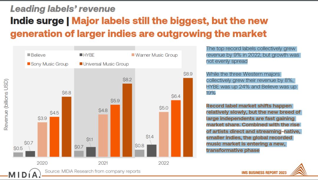 至少不是开倒车;在版税收入(音乐播放生成的版权费用)方面,Self-Releasing Artists(不通过厂牌发布音乐而是自己走平台上传的艺人)的版税收入增长最快。