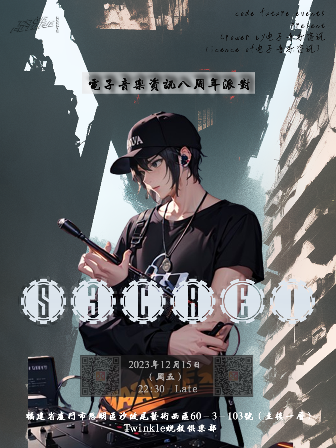 2023年12月15日 星期五 22:30~Late福建省厦门市思明区沙坡尾艺术西区60-3-103号(主楼一层) Twinkle蜕壳俱乐部(Takeover)Hexa (Founder Of Bass Events)、Forkyrie、S3crEt (Resident Support)(Power By电子音乐资讯Events,Licence Of电子音乐资讯Events)