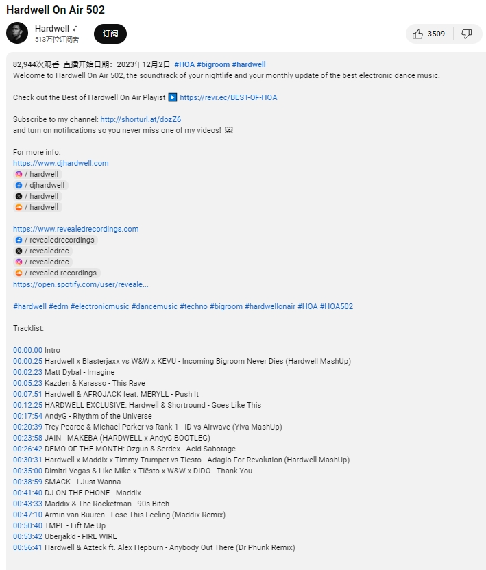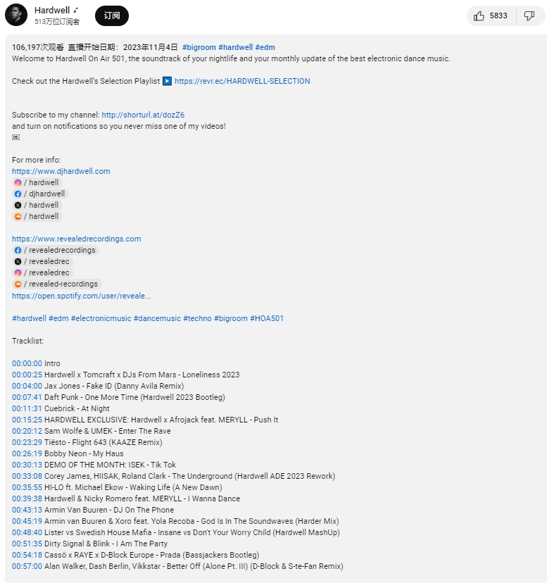 需要强调一下,Hardwell On Air,顾名思义,是Hardwell个人“自电台”,你也可以把它俗称作Hardwell Radio。事实上,早期Hardwell On Air在获得美国、加拿大、荷兰等地的电音、EDM报道的时候,确实多次被简单明了地“英翻白话”至Hardwell Radio。图片来自Hardwell SNS截图 图片版权属于原主那么既然是Hardwell个人“自电台”,必然与Hardwell创立的“R厂”Revealed Recordings旗下电台有异:简化科普,前者是用于发布个人Continuous Mix的单人电台,而后者是一个(种)品牌化的电台,用于发布厂牌和公司的更多Continuous Mix。两年后的“今天”,或者前溯2023年11月,Hardwell On Air终于回归,并在2023年11月4日,于Hardwell个人YouTube的“直播”版块,释出了《Hardwell On Air 501》:回归后的第一期节目。“硬威尔”AKA“硬好”再度与全网订阅者,“携屏”弹幕云Rave。