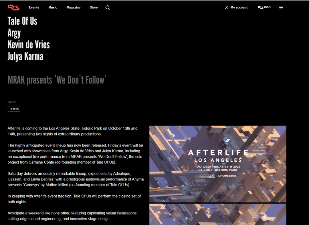 图片来自Afterlife Events 图片版权属于原主Mrak Presents We Don't Follow,Mrak的特别表演项目,除却声光电和各种Afterlife Events把控的活动出品质量之外,Mrak Presents We Don't Follow还将在演出中播演大量未发布的ID曲目,并与活动举办当中的所有环节做特别互动。图片来自Afterlife Events 图片版权属于原主Anyma Presents Genesys,同理,这个名字代表的不仅仅只是Anyma的第一张录音室专辑《Genesys》,还是一个特别的演出Side Project,利用Audio-Visual Show(AV Show)的顶级体验模式,又与大量的Anyma的未发布ID结合一起。