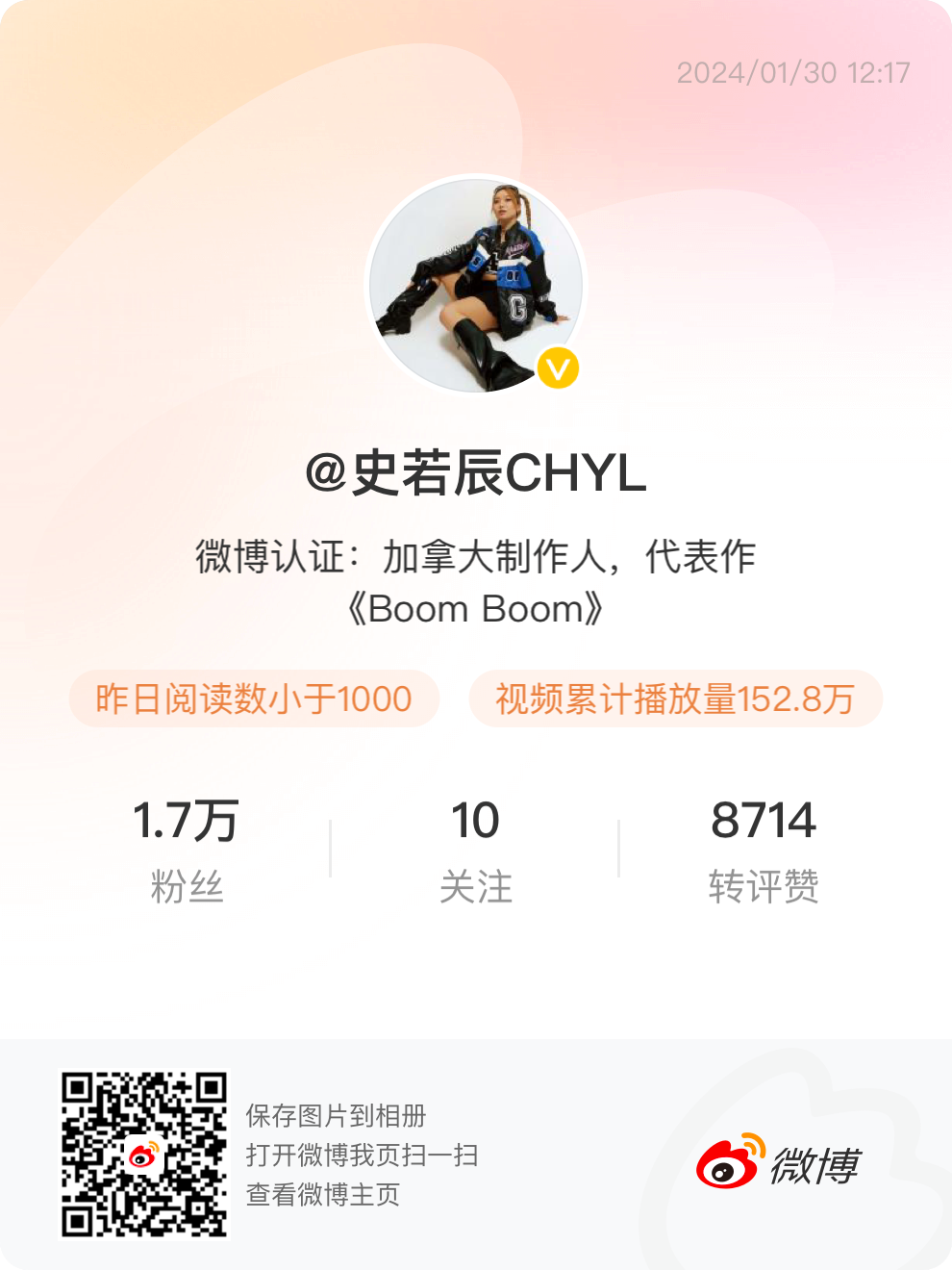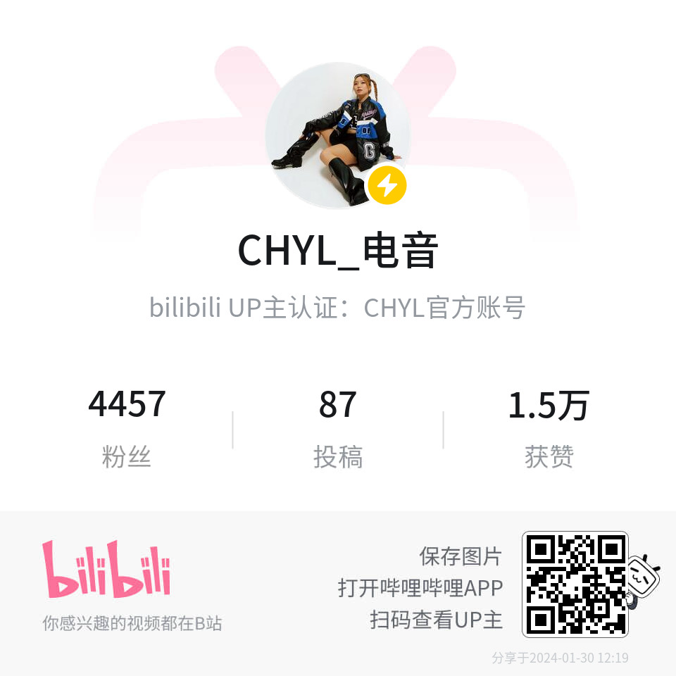 2024年的两大“爆闻”只是个开始。CHYL(史若辰)在微博、网易云音乐、QQ音乐、Bilibili和抖音均创立了账号,想要关注CHYL的更多表演行程以及新作品的动向,可以在上述五大平台搜索CHYL并关注她。We Go Fast未必只适用于Speed House和卡丁车,CHYL也将与这句口号同调,持续释放正能量。