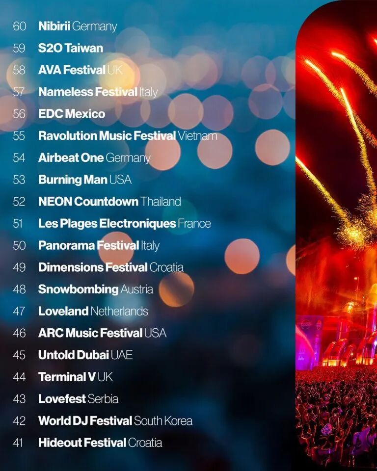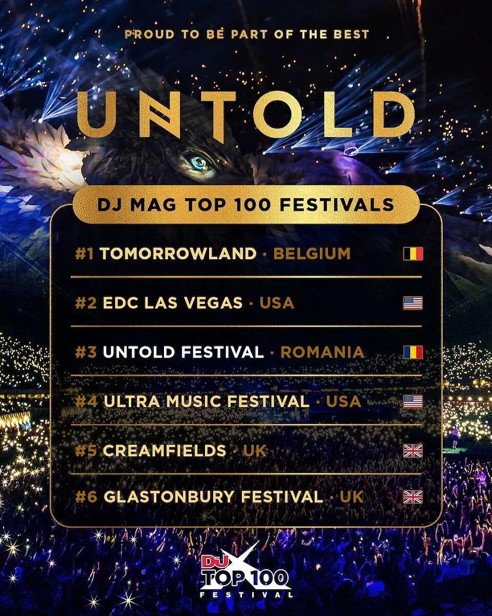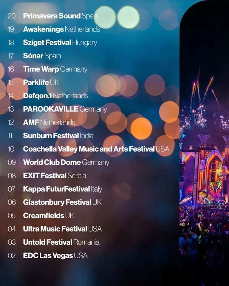 本文内容较多较杂,初略(不是粗略)分为八部分。因而此,电子音乐资讯的现任作者Reborn友情建议读者伙计们结合小标题阅读,一个小标题就是一个自有的章节。「电子音乐资讯®」或写作「电子音乐资讯」®在过去九年的媒体输出时间内,无数次科普电音节是什么、三大电音节又是什么。但奈何Yi Qing三年,断层太过严重,许多“断层期”出现的EDM Kids(EDM新手),其实对三、五汉字存在很大的理解错误。图片来自Tomorrowland主站 图片版权属于原主音乐节,翻译前原词Music Festival,但也可以缩写为Festival(从上世纪大概60年代开始,人们就已经这么缩写)。而电子音乐节,原词Electronic Music Festival,同样的道理,咱们也可以将其省略“Music”,缩写至Electronic Festival(上世纪末开始)。可见,电子音乐节是音乐节的其中一项,是从属关系,而绝非敌对。图片来自Tomorrowland主站 图片版权属于原主中国“电音圈”从2015年开始,一直流传着「三大电音节」的Title和营销噱头,但很多EDM Kid或许不知道,三大电音节是由排名决定,不是由噱头决定。不是我们自己“硬吹”谁是三大,而是广泛国内外媒体,尤其是SEO高排名的电音媒体,普遍说哪三大。图片来自Tomorrowland主站 图片版权属于原主事出必有缘有故,且三大电音节可是世界顶部的指引,会影响大部分EDM萌新的了解、信息判断,必须有源(这个源,指是来源),而非胡扯。曾经国内外媒体普遍认为的电音节前三或确实位列排行榜前三者,分别是Tomorrowland、EDC和Ultra。图片来自Tomorrowland主站 图片版权属于原主人尽皆知,大家口中的全球百大DJ排行榜,大部分时候指的是DJ Mag呈现的Top 100 DJs(百大DJ)。非同时、但后来,DJ Mag还呈现了Top 100 Clubs(百大俱乐部)、Top 100 Festivals(百大音乐节)和Alternative Top 100 DJs(另版百大DJ),四者的海外号召力持平。图片来自One Piece漫画Talkop海外彩绘 图片版权属于原主DJ Mag Top 100 Festivals(百大音乐节)是DJ Mag从2019年推出的排行榜,《电子音乐资讯》每一年都对这张排行榜进行了专题报道。而在去年和今年,DJ Mag Top 100 Festivals(DJ Mag百大音乐节)均突破了投票数据,一年更比一年高。和Top 100 Clubs(百大俱乐部)、Top 100 DJs(百大DJ)一样,最早DJ Mag Top 100 Festivals(DJ Mag百大音乐节)也是由内部票选的(工作人员或外聘DJ作为评委帮忙),但后来就改成DJ Mag官网的注册用户们投票了。自DJ Mag Top 100 Festivals(DJ Mag百大音乐节)诞生来,位列世界前三的电子音乐节(Electronic Music Festival/Electronic Festival)几次被重新定义、定论,比如去年,位列前三的则是Tomorrowland比利时主站、UMF美国主站和Glastonbury音乐节英国主站。图片来自Untold Festival秀成绩2023 图片版权属于原主泛电子音乐萌新们可能会为Glastonbury音乐节英国主站陌生,但泛流派、综合型音乐节的老炮们就一定知道Glastonbury Festival。这个诞生于上世纪70年代的老炮IP结合了Pop、Blues、Folk、Electronic和艺术表演、正宗嘉年华表演项目,每年吸引20多万人(数)购票,连续举办五天(笔者在2016年就跟朋友聊过“五日のUK传奇”),电音比重不大。