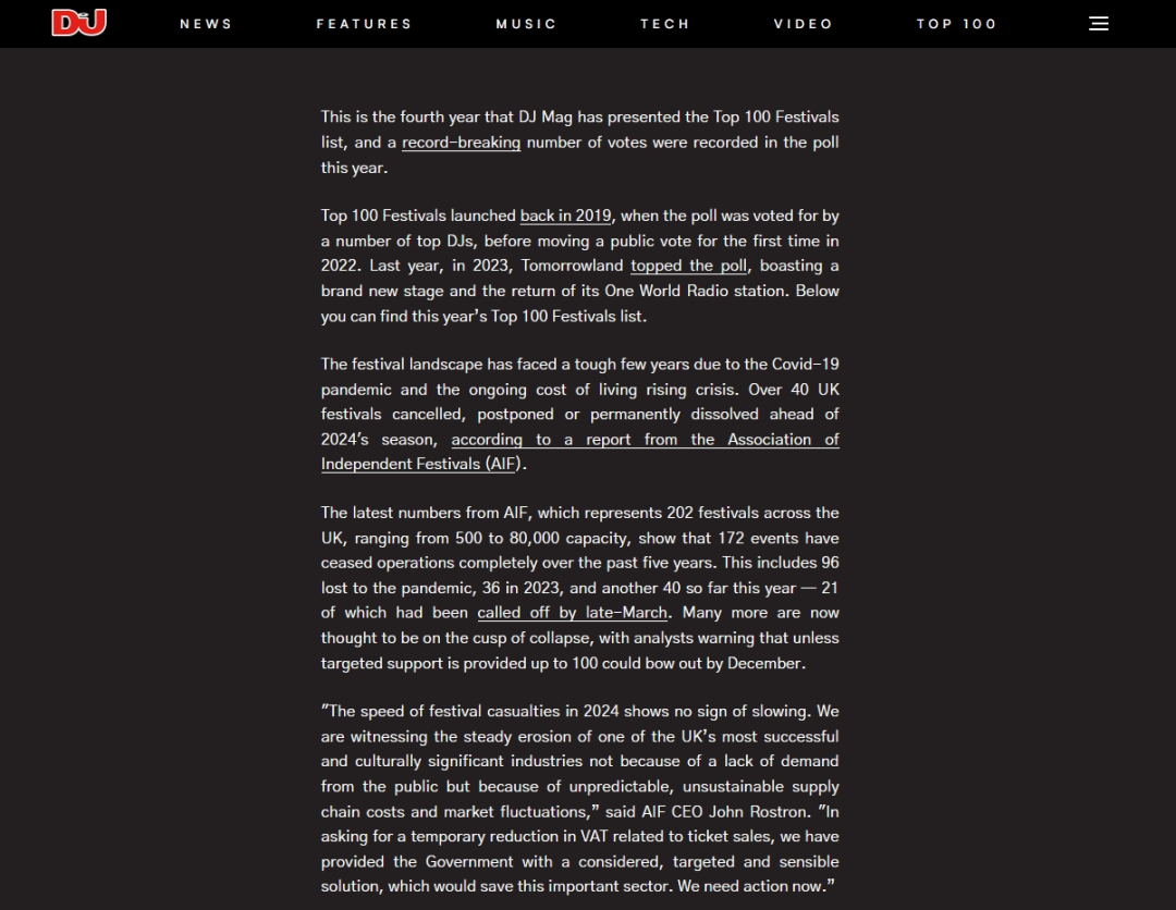 图片来自Glastonbury Festival 2023 图片版权属于原主有人会觉得Tomorrowland比利时主站、UMF美国主站和Glastonbury音乐节英国主站占据DJ Mag百大电音节(音乐节)前三位,说服力不强,因为他们很大概率不认可Glastonbury的电子音乐内容及占比。但2024年的再次“Ge Ming”,就向“褒”发展啦。图片来自Glastonbury Festival 2023“分项” 图片版权属于原主图片来自Untold Festival秀成绩2024 图片版权属于原主荣登三大电音节2024结果的是电音节冠军常青树Tomorrowland比利时主站、重回(为什么是重回,因为最早就是)三大电音节老二的EDC美国主站,还有一直都非常关注、非常在意DJ Mag百大音乐节成绩的铜牌得主Untold Festival罗马尼亚(主)站!!图片来自Untold Festival罗马尼亚(主)站2024 图片版权属于原主Untold Festival在多年的努力下(他们一直都很在意这个榜单的名次)终于挤入前三,不管电音爱好者们是否在意,但他们绝对很在意。就事发及撰文当天,已经有很多海外媒体报道Untold Festival跻身前三之事,不少东南欧和北美洲的Raver们惊呼变天。图片来自Beatdigital.Mx 图片版权属于原主最早的音乐节定义,是在户外举行、临时搭建而且临时存在的音乐乌托邦,超大规模的表演;而后来,把正统(户外)音乐节搬入室内的举动得到了部分主办方的认可和高拟真执行,“室内音乐节”就此诞生,保留了临时搭建、临时存在、大规模的音乐节乌托邦条件,从户外公园等空间,搬入室内的竞技场(Arena)。图片来自AMF“室内音乐节”(真竞技场)图片版权属于原主在今年的DJ Mag百大音乐节(电音节)排行榜中,“室内音乐节”的占比很低很低,但不代表没有,仍然有几个知名度很高的室内竞技场举办的“室内音乐节”IP入围、获名获利。但值得庆幸的是,这些“室内音乐节”都是正儿八经的竞技场大活动,无夸大营销。图片来自AMF“室内音乐节”(真竞技场)图片版权属于原主2017年,由麦爱文化和电子音乐资讯公司联合主办的Code Future Warehouse Party,就是在琶醍双仓库的大厅(包装车间是大厅,另一为小厅)举办的纯正仓库派对。举办之前的场地为完完全全的数千人空间毛坯废弃厂房,完全达到了“室内电音节”:虽仓犹节。图片来自Code Future仓库派对2017 图片版权属于原主Code Future Warehouse Party由Virtual Riot扮演唯一的Headliner,由徐梦圆扮演特别嘉宾(Special Guest),其他人为官方Support;另一观点说,是Virtual Riot扮演国际Headliner,其他人包括徐梦圆在内均为官方选中的中、大牌Supporting。所有电音节必须执行的工作,都在这场“室内音乐节”被操办,将毛坯仓库搭建改造单日乐园。图片来自真正的仓库派对VS.真正的“室内电音节” 图片版权属于原主按照原计划,本文还打算跟大家聊聊DJ Mag Top 100 Clubs一些有趣,或者不够精准的地方;一些可以包含,但不适合包含的类型——不像“室内音乐节”值得包容了。但因篇幅原因,DJ Mag Top 100 Clubs的一些归属不当Bug,尚只能“未”回分解。(完)图片来自AMF“室内音乐节”(真竞技场)图片版权属于原主——————————————————————————