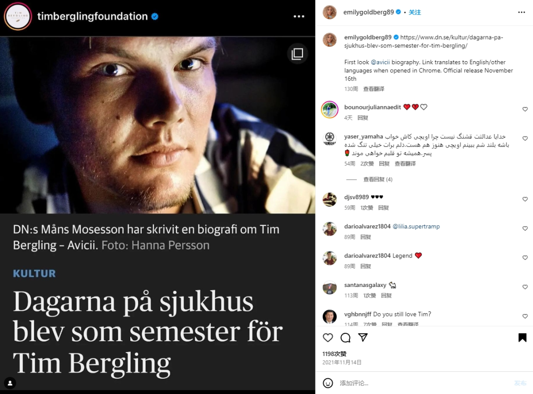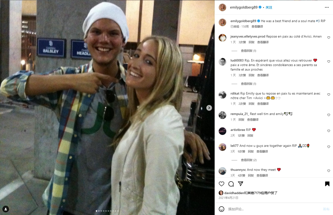 即使在Avicii Li Shi后,E*ily G*ldberg也经常发布着与Avicii有关的帖子。频繁的时候,每个月都会发布跟Avicii有关的照片和旧Wen、Xin Wen。
