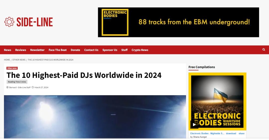 Side-Line是一个音乐杂志品牌,自称以Darkwave、Industrial、Electro和Post-Punk为主导内容。Side-Line的主编(Chief Editor) Bernard说:“著名杂志和财务统计学家每年都会列出一个专业团体最成功的成员名单,其中也包括DJ,而DJ们在音乐会中获得的收入有些时候会令人震惊”。