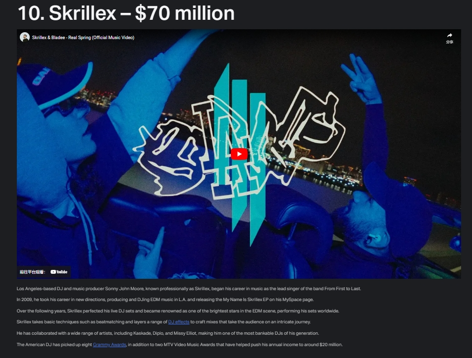 回到2023年,我们可以发现一些类似的情况,即,虽然看起来不由Forbes(福布斯)报道,但却使用Forbes(福布斯)的数据支撑,而总结出来的年度(过去12个月)最赚钱的10位DJ的数据更新。