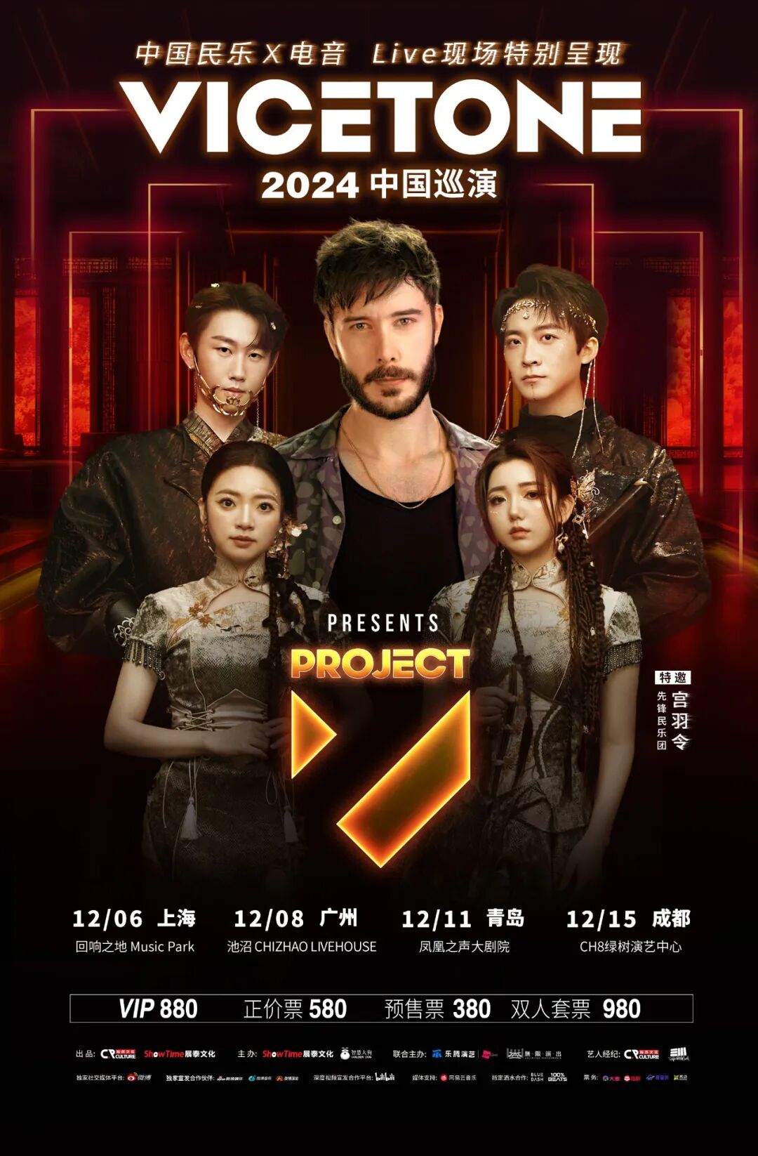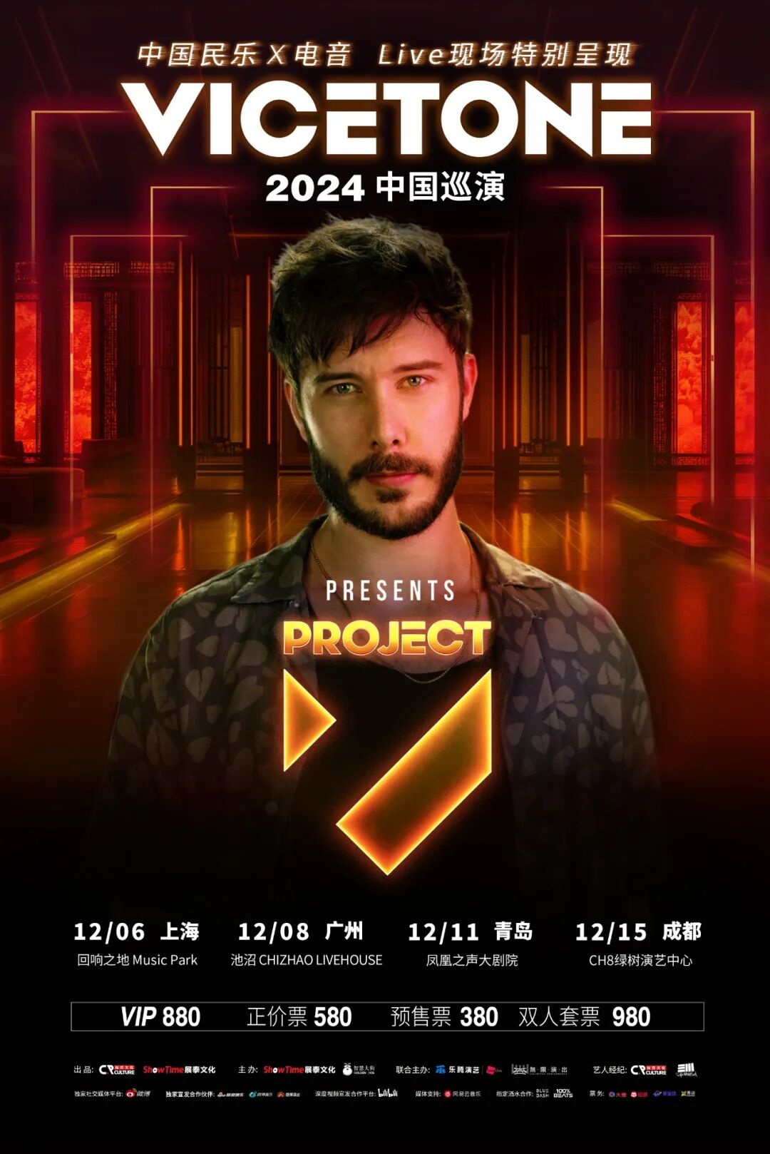 图片来自Project V Tour 图片版权属于原主12月6日至12月15日之间,十亿流媒体及社交媒体流量的“V神” Vicetone(注,因双人组已经调整为一人DJ、一人制作人的模式,所以来演出的实际上是成员之一的Victor Pool)与先锋民族乐团宫羽令(ECHOLINK)的民乐演奏家们共同制造极具价值的独家现场观演体验!强强联手?这波可是荷兰EDM“强强强强”与中国民乐“强强强强”的世界级展示。图片来自Vicetone+黑殿·宫羽令 ECHOLINK乐团(宫羽令) 图片版权属于原主广东省广州市番禺区新造镇和平路1号良仓创意园21号仓 池沼CHIZHAO LIVEHOUSEVicetone+黑殿·宫羽令 ECHOLINK乐团(宫羽令)Vicetone 2024中国巡演 中国民乐×电音Live现场Presents Project V Tour预售票380元、正价票580元、VIP票880元、双人套票980元图片来自Vicetone 2024中国巡演 中国民乐×电音Live现场Presents Project V Tour 图片版权属于原主图片来自Vicetone 2024中国巡演 中国民乐×电音Live现场Presents Project V Tour 图片版权属于原主山东省青岛市黄岛区青岛金沙滩啤酒城 凤凰之声大剧院Vicetone+黑殿·宫羽令 ECHOLINK乐团(宫羽令)Vicetone 2024中国巡演 中国民乐×电音Live现场Presents Project V Tour预售票380元、正价票580元、VIP票880元、双人套票980元图片来自Vicetone 2024中国巡演 中国民乐×电音Live现场Presents Project V Tour 图片版权属于原主图片来自Vicetone 2024中国巡演 中国民乐×电音Live现场Presents Project V Tour 图片版权属于原主四川省成都市成华区青龙街道天府国际动漫城 CH8绿树演艺中心Live HouseVicetone+黑殿·宫羽令 ECHOLINK乐团(宫羽令)Vicetone 2024中国巡演 中国民乐×电音Live现场Presents Project V Tour预售票380元、正价票580元、VIP票880元、双人套票980元图片来自Vicetone 2024中国巡演 中国民乐×电音Live现场Presents Project V Tour 图片版权属于原主图片来自Vicetone 2024中国巡演 中国民乐×电音Live现场Presents Project V Tour 图片版权属于原主——————————————————————————