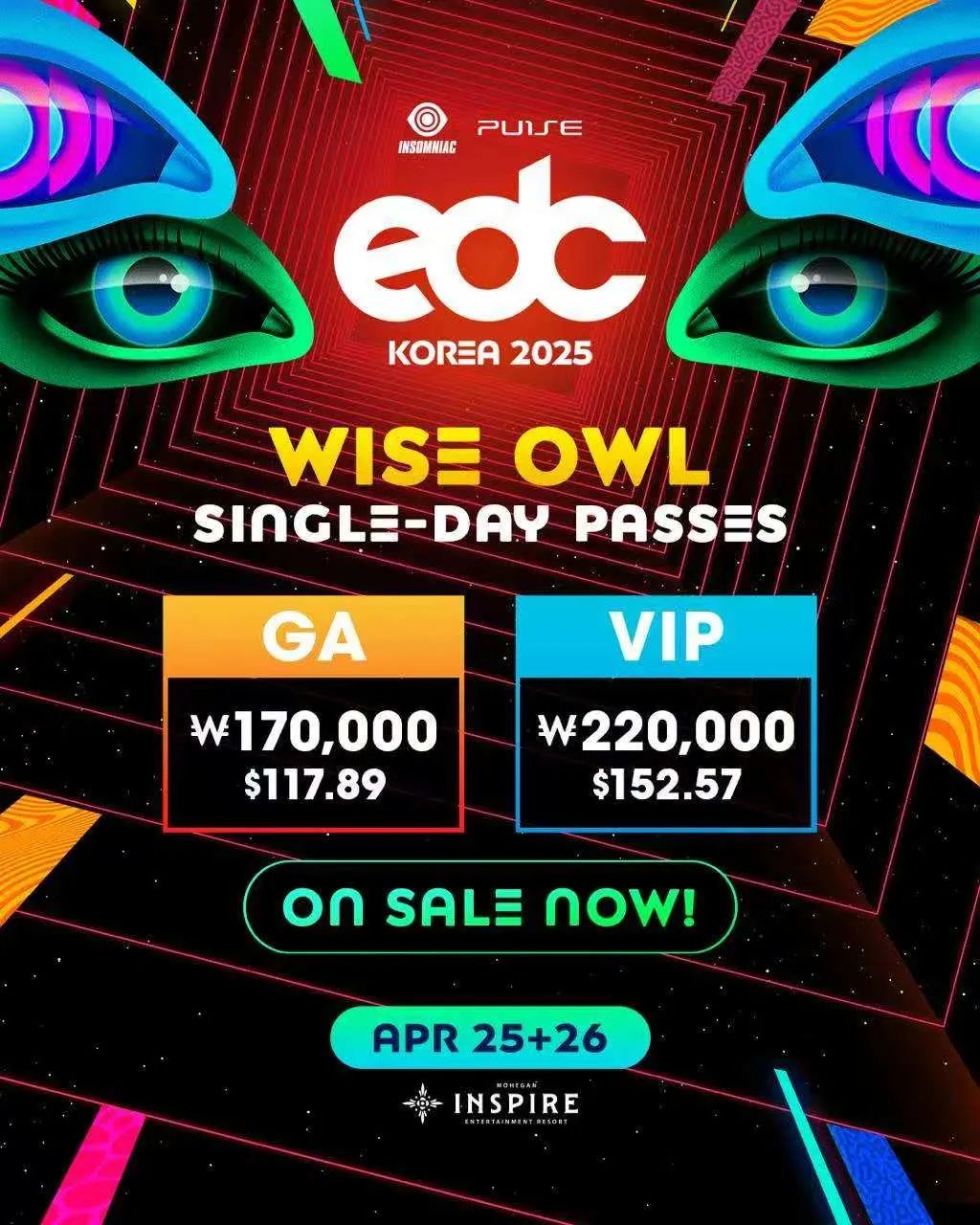 的中文地区子公司官方认证标志。这将是目前除微信公众平台/服务号之外能够获取最多中文官方信息的渠道。图片来自EDC Korea Official 图片版权属于原主EDC Korea的活动时间已经从一开始的12:00至Late 03:00十五个小时,更新至17:00至Late 03:00十个小时。时间的压缩也许会为你带来更好的Raving体验,减少疲劳和过压的可能,请勿空跑或早跑哦。图片来自EDC Korea官网 | EDC Korea票务平台 图片版权属于原主2025年4月25日~4月26日 星期五~星期六 17:00~次日深夜03:00韩国仁川市中区光化门花路127号 Inspire Entertainment Resort迎仕柏娱乐度假城Inspire Discovery Park + Inspire Arena四舞台搭建音乐乌托邦ALL OF YOU、SKRILLEX、PEGGY GOU、MARTIN GARRIX、CHARLOTTE DE WITTE、DOM DOLLA、ILLENIUM、I HATE MODELS、PAUL VAN DYK、BOYS NOIZE、BLOND:ISH、Steve Aoki、BENNY BENASSI、DILLON FRANCIS、DEORRO、MALAA、GIUSEPPE OTTAVIANI、TRYM、MADDIX、SAM FELDT、MORTEN、BLASTOYZ、DA TWEEKAZ、MARLO、LOUD LUXURY、BLACK TIGER SEX MACHINE、ACRAZE、ATLIENS、AK SPORTS、CHASEWEST、DEVAULT、ELI BROWN、ION、JESSICA AUDIFFRED、LAYTON GIORDANI、MATRODA、MIA MORETTI、NIFRA、SAYMYNAME、SOSA、SUB ZERO PROJECT、Avalon等智慧鹰双日GA 1597元、智慧鹰双日VIP 2112元、智慧鹰单日GA 876元、智慧鹰单日VIP 1133元双人双日门票+酒店套餐8106元~9490元、双人单日门票+酒店套餐4172元~5386元请扫描下方二维码进入「Interpark Global」官方购票链接图片来自EDC Korea 2025(中国事务执行电子音乐资讯旗上公司×Kxs Edit) 图片版权属于原主请扫描下方二维码进入「247玩乐行Tickets」官方购票链接图片来自EDC Korea 2025 图片版权属于原主图片来自EDC Korea 2025 图片版权属于原主图片来自EDC Korea 2025 图片版权属于原主图片来自EDC Korea 2025 图片版权属于原主请扫描下方二维码进入「网易云音乐云村有票」官方购票链接图片来自EDC Korea 2025 图片版权属于原主图片来自EDC Korea 2025 图片版权属于原主请扫描下方二维码进入「芋圆Yuyuan」官方购票链接图片来自EDC Korea 2025 图片版权属于原主图片来自EDC Korea 2025 图片版权属于原主图片来自EDC Korea 2025 图片版权属于原主图片来自EDC Korea 2025 图片版权属于原主图片来自EDC Korea 2025 Team China 图片版权属于原主——————————————————————————