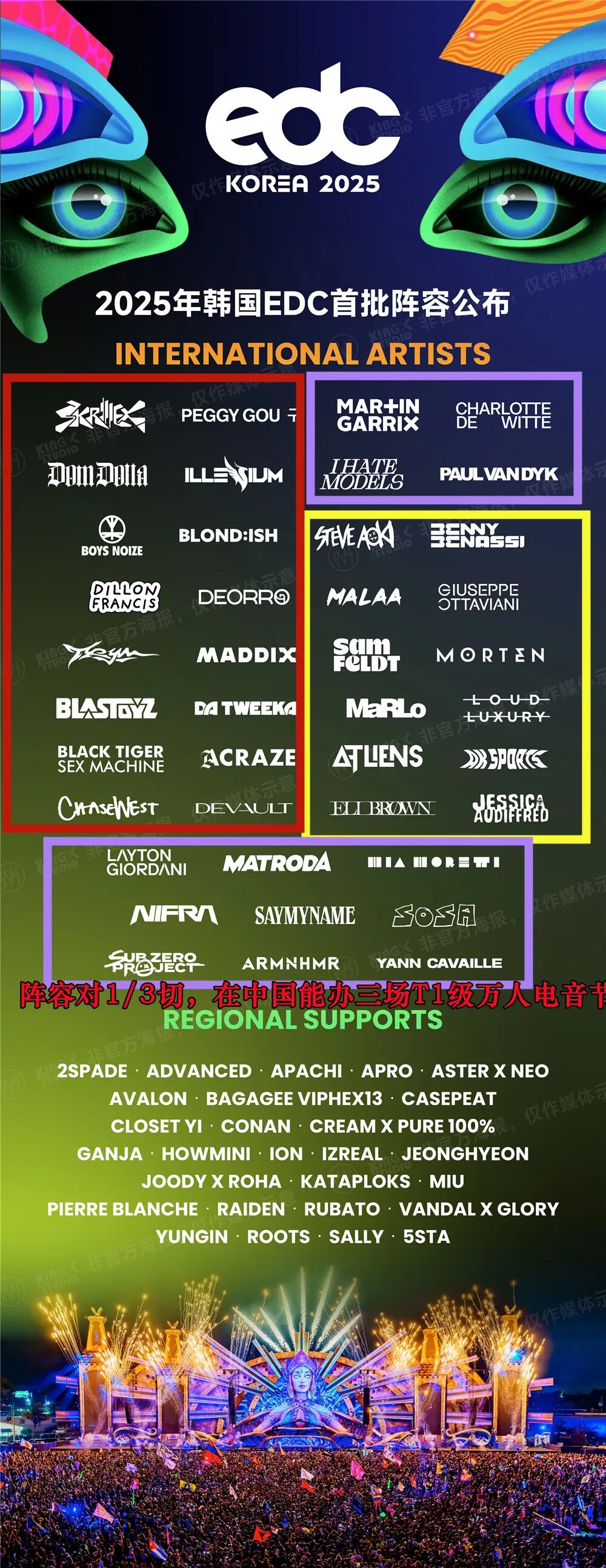买票!买票!买票!买票!买票!买票!买票!买票!买票!买票!买票!买票!买票!买票!买票!买票!买票!买票!买票!买票!买票!买票!买票!根据“大道”消息,EDC Korea目前的票房已超越EDC除了主站之外的其它站点一大截啦!不愧是亚洲保守前三、客观前二的超顶阵容。 图片来自EDC Korea Team China 图片版权属于原主 “超越EDC除了主站之外的其它站点一大截啦!不愧是亚洲保守前三、客观前二的超顶阵容。”,这样的说法可不是夸大营销、恶意营销、编造营销。您看看,这份阵容的媒体版本,如果对半切,在国内办两场T0级别的电音节,一点毛病也没有。Reborn本人实名支持对半切。 图片来自电子音乐资讯等媒体 | Edit 图片版权属于原主 如果把EDC Korea 2025的阵容对1/3切,在国内办两场T1级别的万人电音节,也完全能够实现。不过在笔者个人的“充分幻想”中,还是觉得这份阵容最好的处理方式是对半切,绝对能把两场电音节都做得相当炸裂,对1/3切不好说哦,对半切的话2万到3万+人肯定没问题。 图片来自电子音乐资讯等媒体 | Edit 图片版权属于原主 剩下的一切话语,我们交给EDC Korea官方。扫码关注EDC Korea的中国地区微信公众号/服务号:EDCK2025!它是个加以主办方1Pulse Events中国直属子公司1Pulse China“观云”企业认证的服务号,一个月您能接收四次的推送。锁定并认准EDCK2025! 图片来自EDC Korea Official 图片版权属于原主 扫码添加EDC Korea的中国地区企业微信!EDC韩国·官方管理员,请再次认准主办方 的中文地区子公司官方认证标志。这将是目前除微信公众平台/服务号之外能够获取最多中文官方信息的渠道。 图片来自EDC Korea Official 图片版权属于原主 EDC Korea的活动时间已经从一开始的12:00至Late 03:00十五个小时,更新至17:00至Late 03:00十个小时。时间的压缩也许会为你带来更好的Raving体验,减少疲劳和过压的可能,请勿空跑或早跑哦。 图片来自EDC Korea官网 图片版权属于原主 时间: 2025年4月25日~4月26日 星期五~星期六 17:00~次日深夜03:00 地点: 韩国仁川市中区光化门花路127号 Inspire Entertainment Resort迎仕柏娱乐度假城Inspire Discovery Park + Inspire Arena四舞台搭建音乐乌托邦 人物: All Of You、 Skrillex、Peggy Gou、Martin Garrix、Charlotte De Witte、Dom Dolla、Illenium、I Hate Models、Paul Van Dyk、Boys Noize、Blond:Ish、Steve Aoki、Benny Benassi、 Dillon Francis、Deorro、Malaa、 Giuseppe Ottaviani、Trym、 Maddix、Sam Feldt、Morten、Blastoyz、Da Tweekaz、Marlo、Loud Luxury、Black Tiger Sex Machine、 Acraze、Atliens、 Ak Sports、Chasewest、Devault、Eli Brown、Ion、Jessica Audiffred、Layton Giordani、Matroda、Mia Moretti、Nifra、Saymyname、Sosa、Sub Zero Project、Yann@Euro等 举办: 1Pluse Events(US)、Insomniac 名称: EDC Korea 2025 票价: 智慧鹰双日GA 1597元、智慧鹰双日VIP 2112元、智慧鹰单日GA 876元、智慧鹰单日VIP 1133元双人双日门票+酒店套餐8106元~9490元、双人单日门票+酒店套餐4172元~5386元 购票⑴: 请扫描下方二维码进入「Interpark Global」官方购票链接 图片来自EDC Korea 2025 Team China 图片版权属于原主 购票⑵: 请扫描下方二维码进入「247玩乐行Tickets」官方购票链接 图片来自EDC Korea 2025 图片版权属于原主 购票⑶: 请扫描下方二维码进入「秀动」官方购票链接 图片来自EDC Korea 2025 图片版权属于原主 购票⑷: 请扫描下方二维码进入「票星球」官方购票链接 图片来自EDC Korea 2025 图片版权属于原主 购票⑸: 请扫描下方二维码进入「大麦」官方购票链接 图片来自EDC Korea 2025 图片版权属于原主 购票⑹: 请扫描下方二维码进入「网易云音乐云村有票」官方购票链接 图片来自EDC Korea 2025 图片版权属于原主 购票⑺: 请扫描下方二维码进入「支付宝蓝花火」官方购票链接 图片来自EDC Korea 2025 图片版权属于原主 购票⑻: 请扫描下方二维码进入「芋圆Yuyuan」官方购票链接 图片来自EDC Korea 2025 图片版权属于原主 购票⑼: 请扫描下方二维码进入「飞猪」官方购票链接 图片来自EDC Korea 2025 图片版权属于原主 购票⑽: 请扫描下方二维码进入「小红书小程序」官方购票链接 图片来自EDC Korea 2025 图片版权属于原主 卡座: 如下图 图片来自EDC Korea 2025 图片版权属于原主 EDC Hotel: 如下图 图片来自EDC Korea 2025 Team China 图片版权属于原主 当EDC Korea的官方预热派对来到中国 2025年3月31日,即3月最后一天,EDC Korea官方宣布了今年预热派对项目《Road To EDC Korea》当前的中国两站,一站是Road To EDC Korea香港站,一站是Road To EDC Korea哈尔滨站。哪怕是“小活动”,也满足了一次国际Event IP再次来华的小小心愿。 图片来自EDC Korea 2025 Team China 图片版权属于原主 其中,Road To EDC Korea香港站的DJ是全球著名的Hard-Techno女新星Negitiv作为领衔嘉宾,由中国香港当地的DJ/制作人们强力助阵。主办方、赞助商与Event Venue强强联手,中国香港的朋友们,考虑考虑?此时不冲更待何时? 图片来自EDC Korea Official Team China 图片版权属于原主 Road To EDC Korea哈尔滨站则由EDC Korea的嘉宾之一SPECT,多次在Barong Family发行作品的他领衔主演。Supermiami的舞台部DJ干将们助阵,期待能在目前为止Road To EDC Korea中国内地唯一一站听到令人兴奋的EDCK嘉宾们的经典好曲! 图片来自EDC Korea Official Team China 图片版权属于原主 —————————————————————————— 文章版权归电子音乐资讯上属运营公司品牌方所有