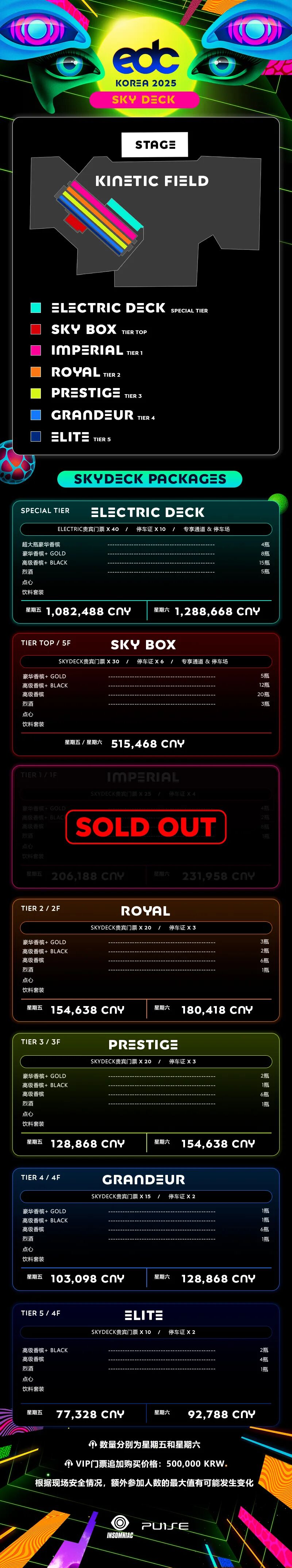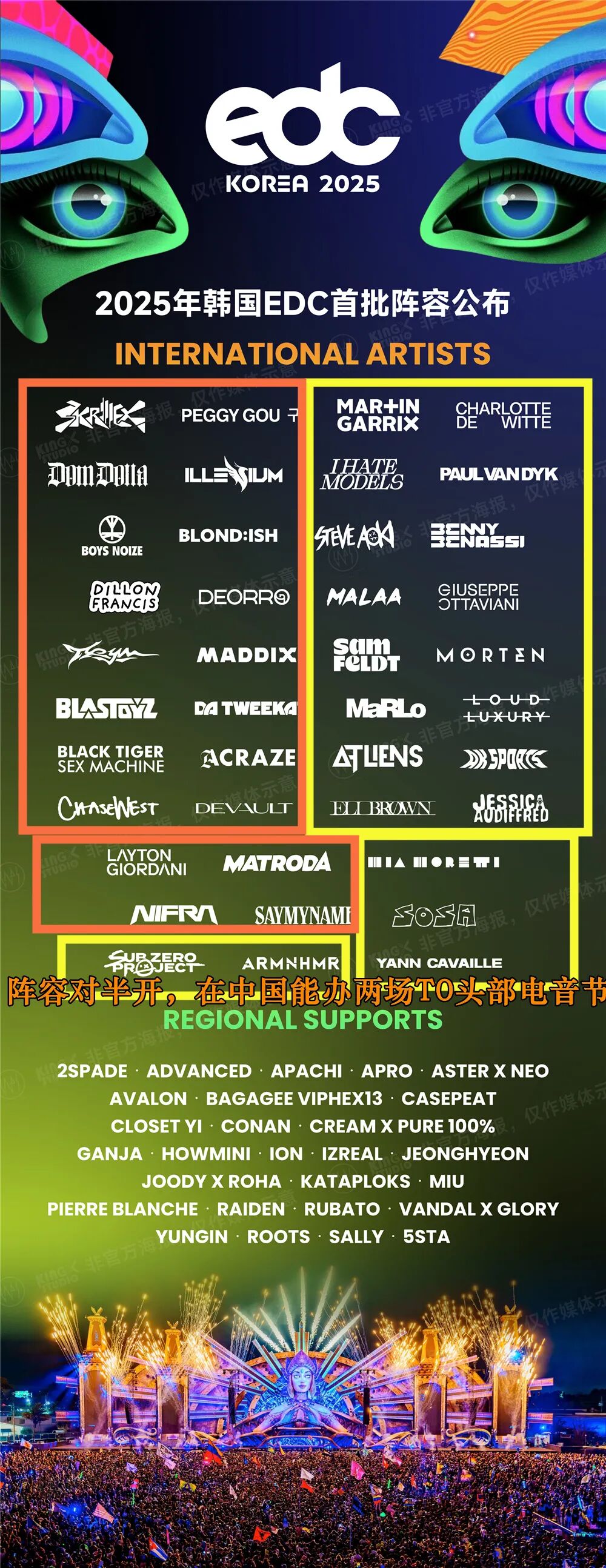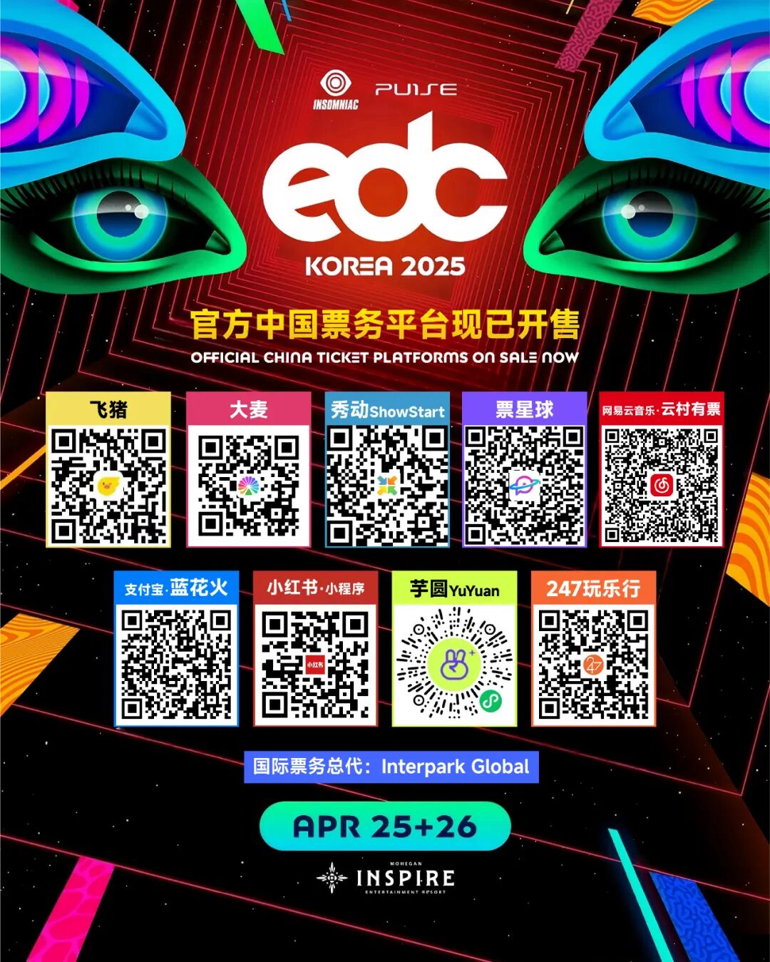 All Of You、 Skrillex、Peggy Gou、Martin Garrix、Charlotte De Witte、Dom Dolla、Illenium、I Hate Models、Paul Van Dyk、Boys Noize、Blond:Ish、Steve Aoki、Benny Benassi、 Dillon Francis、Deorro、Malaa、 Giuseppe Ottaviani、Trym、 Maddix、Sam Feldt、Morten、Blastoyz、Da Tweekaz、Marlo、Loud Luxury、Black Tiger Sex Machine、 Acraze、Atliens、 Ak Sports、Chasewest、Devault、Eli Brown、Ion、Jessica Audiffred、Layton Giordani、Matroda、Mia Moretti、Nifra、Saymyname、Sosa、Sub Zero Project、Yann@Euro等1Pluse Events(US总部+KR分公司)、Insomniac智慧鹰双日GA 1597元、智慧鹰双日VIP 2112元、智慧鹰单日GA 876元、智慧鹰单日VIP 1133元双人双日门票+酒店套餐8106元~9490元、双人单日门票+酒店套餐4172元~5386元请扫描下方二维码进入「Interpark Global」官方购票链接图片来自EDC Korea 2025 Team China 图片版权属于原主请扫描下方二维码进入「247玩乐行Tickets」官方购票链接图片来自EDC Korea 2025 图片版权属于原主图片来自EDC Korea 2025 图片版权属于原主图片来自EDC Korea 2025 图片版权属于原主图片来自EDC Korea 2025 图片版权属于原主请扫描下方二维码进入「网易云音乐云村有票」官方购票链接图片来自EDC Korea 2025 图片版权属于原主图片来自EDC Korea 2025 图片版权属于原主请扫描下方二维码进入「芋圆Yuyuan」官方购票链接图片来自EDC Korea 2025 图片版权属于原主图片来自EDC Korea 2025 图片版权属于原主图片来自EDC Korea 2025 图片版权属于原主购票⑾:请扫描下方二维码进入「超级惊喜 电音新App」官方购票链接【敬请期待】图片来自EDC Korea 2025 SkyDeck Tier 1区域全部售罄版 图片版权属于原主图片来自EDC Korea 2025 Team China 图片版权属于原主——————————————————————————