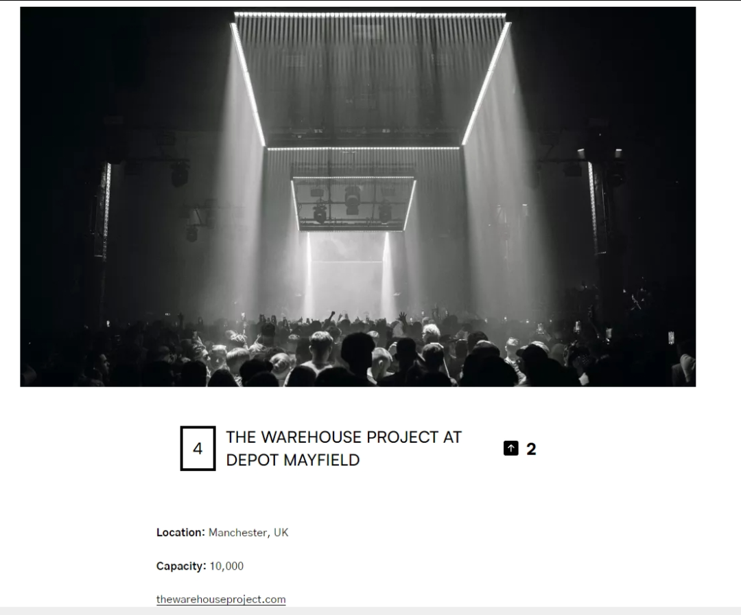 我们需要再强调“亿次”,虽然在《电子音乐资讯》®过去的许多篇文章中,也进行过相等系列的科普和强调。但我们仍需对新读者、路人读者负责。如果您属于电子音乐资讯@微信公众平台近40万订阅者当中的老读者,可以跳过这一“防杠”的法盾部分。图片来自天龙人守门员·海军大将时期战国 图片版权属于原主本标题多地是形容词性和句性,文章内不写DJ Mag百大DJ排行榜内并不是DJ的“DJ”,而是DJ Mag百大Club排行榜内并不是Club的“Club”。但是,DJ Mag百大Club当中不是Club的“Club”,其不合理性≈DJ Mag百大DJ当中不是DJ的“DJ”,所以此等形容不难互通。图片来自异人身体·双果实·黑胡子 图片版权属于原主如果你此时此刻不能理解DJ Mag百大Club榜内的“Club”不是Club有什么大问题,那你试想一下,DJ Mag百大DJ榜内的“DJ”不是DJ,而是一位Rapper、一位吉他手、一位Visual Artist,这“河里”吗?这不“河里”。既然你接受不了后者,那就不应该接受前者!《设想一下DJ Mag百大DJ榜内的人并不是DJ》是本系列“英剧”的第一季,而本文是继续扩展的第二季,就像我们曾经“承诺”的,此系列未完待续。剧情之外地,电子音乐资讯的作者Reborn似乎还在更早的时间与空间下“承诺”过,关于DJ Mag百大DJ榜内不是DJ的“DJ”,亦还将续刊。Warehouse携手Event Venue/Live Venue「讨伐」“夜间俱乐部”一些Warehouse或者Event Venue/Live Venue/Live Music Performance Venue总是在DJ Mag Top 100 Clubs清单内被不合理地归为Club。此事在中国并不被重视,反倒经常有在英国、美国和其它白人居住区“Based”的华侨向我们吐槽它们的不合理,是时候区分Warehouse或者Event Venue/Live Venue与Nightclub了!图片来自Warehouse或 Live Music Performance Venue双双被当成俱乐部??? 图片版权属于原主此选题构思于2018年,埋坑于2024年,填坑实际动笔地构建于2025年今日---全天候。2018年我们才想到把The Warehouse Project at Depot Mayfield在百大Club排行榜中的不良状态写成推文,但这一问题早从2013年就存在着,2013年没马上写,真是抱歉呢。图片来自Reborn的Chrome | Warehouse或 Live Music Performance Venue双双被当成俱乐部??? 图片版权属于原主从2013年到2025年,The Warehouse Project at Depot Mayfield在DJ Mag百大俱乐部排行榜中的位置“系”愈来愈高的。一路从世界第19位杀到世界第4位,即使是其最“低谷”的事情,也在世界第28名。可惜The Warehouse Project at Depot Mayfield不仅不是一家俱乐部,甚至就算把The Warehouse Project at Depot Mayfield定义成Music Live Venue也有所低估了。The Warehouse Project at Depot Mayfield对得起它的名字,它几乎是一个毛坯式的Warehouse,虽然它也确实兼容了Music Live Venue的三成特点。图片来自DJ Mag Top 100 Clubs 图片版权属于原主
